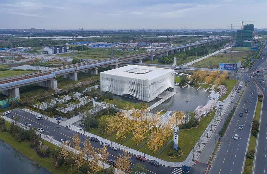 新城控股·MOC芯城汇展示中心位于高铁苏州北站东侧,位于空旷基地,南临南天成路,东临澄阳路,北靠京沪高铁,用地面积1.17公顷,建筑面积6030㎡。
