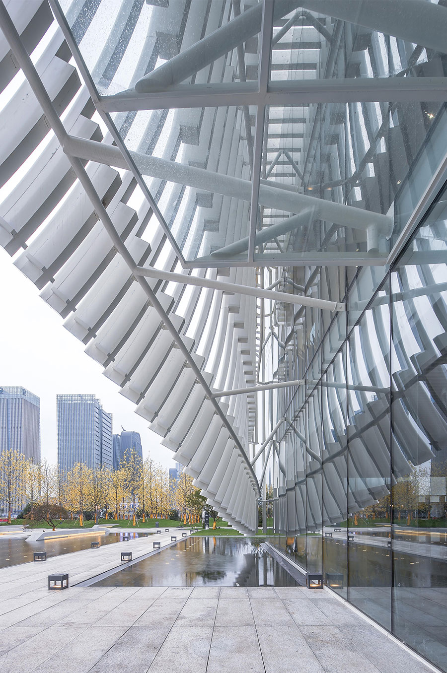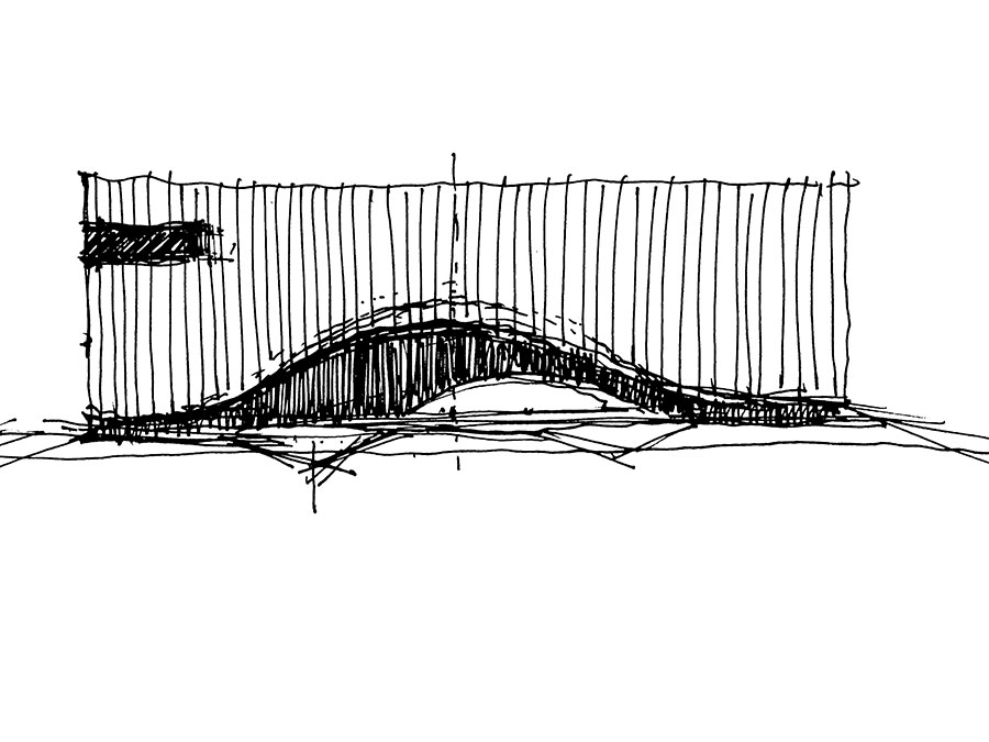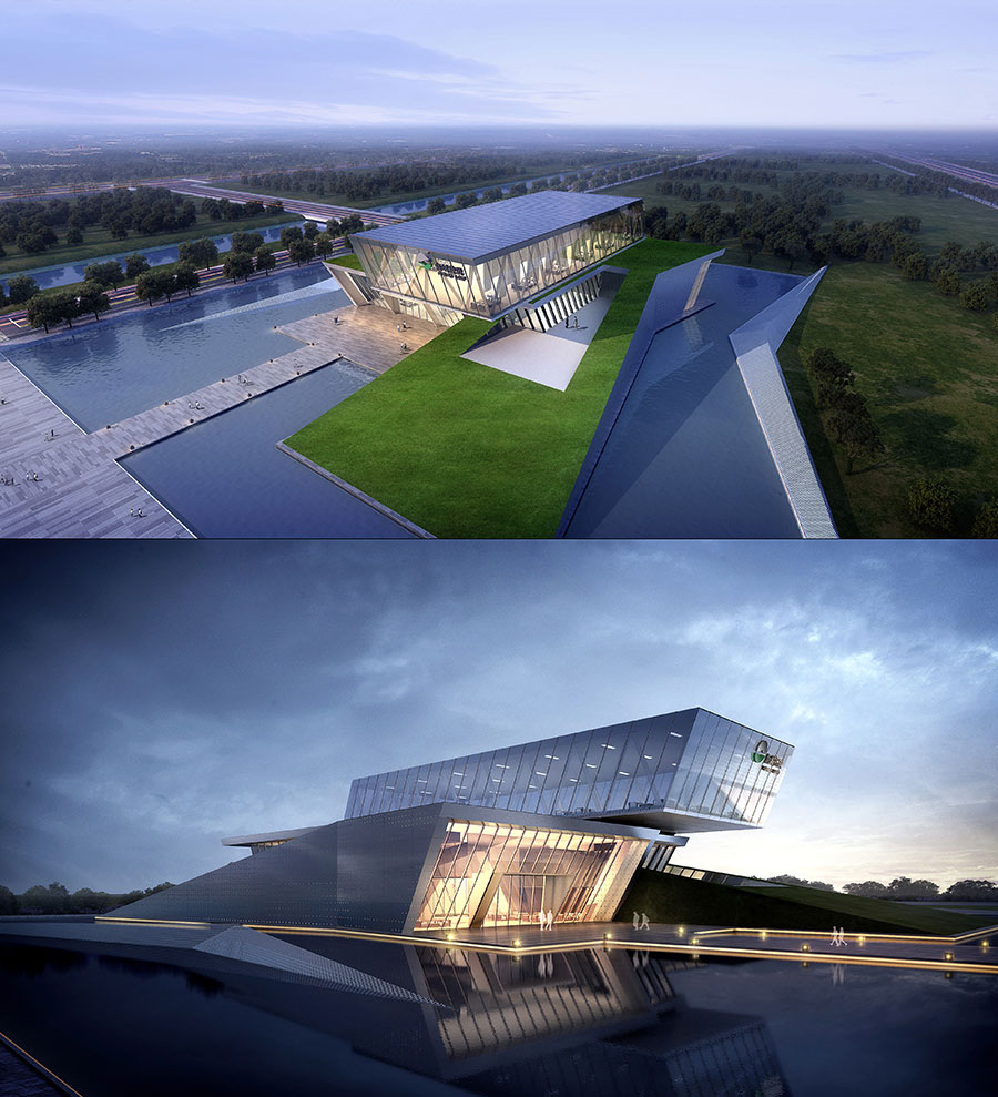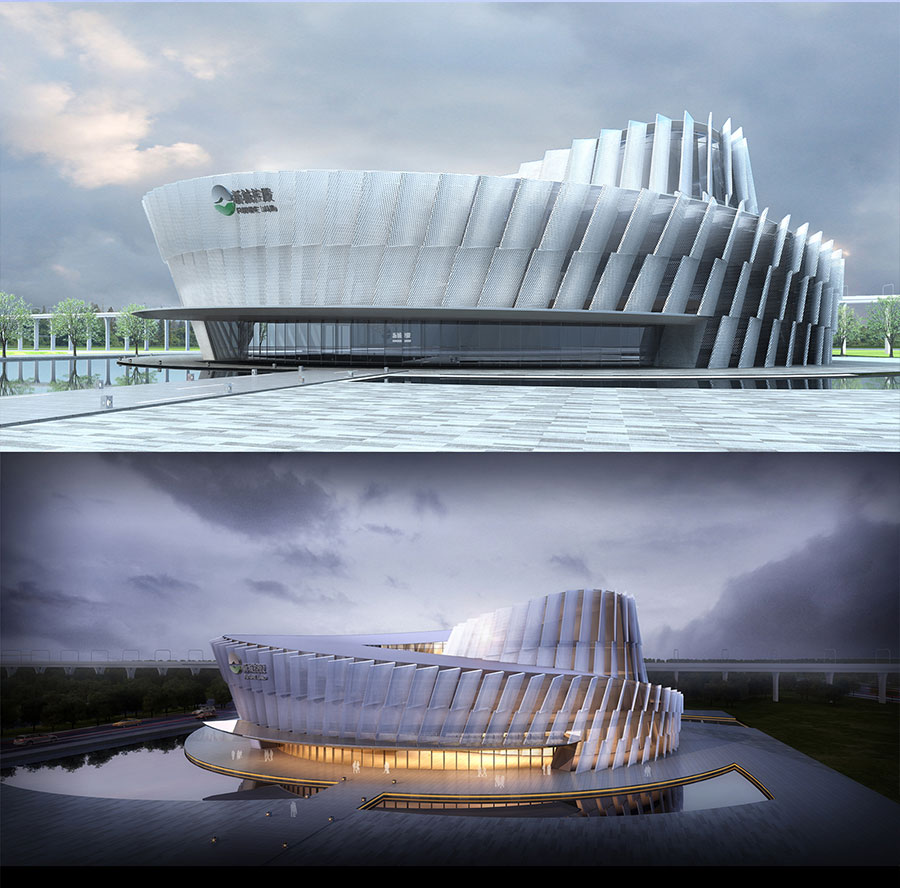 在项目景观打造上,我们强调水景的应用,为保证倒影的完整,将通往建筑主入口的道路设置在侧面,建筑飘逸的曲线外衣倒印在水中,显得那么的迷人,外表皮的形象构思来源于一种乐器,叫马林巴琴,建筑是凝固的音乐,我们希望这个小建筑能在水天的映衬下奏出美妙的乐章。