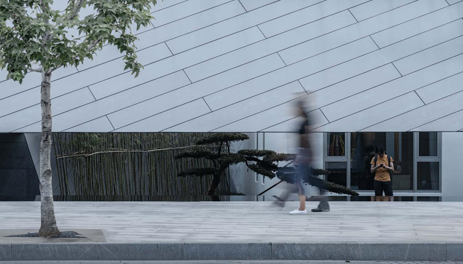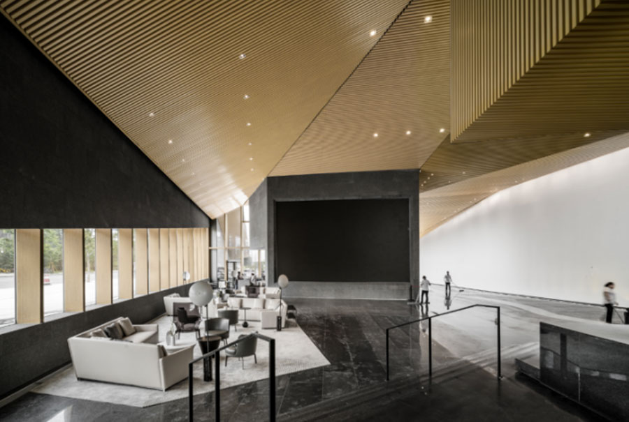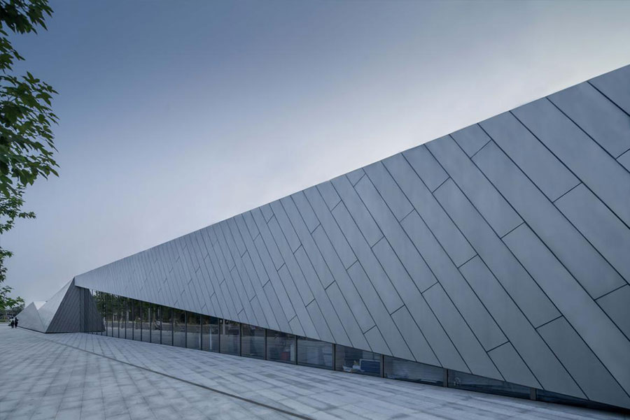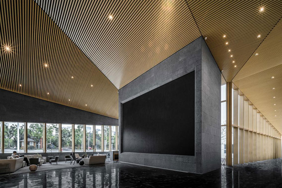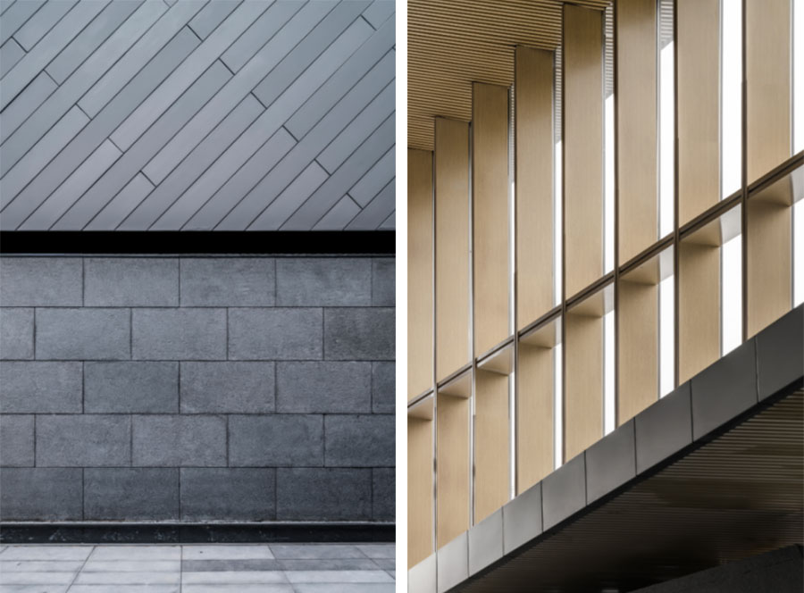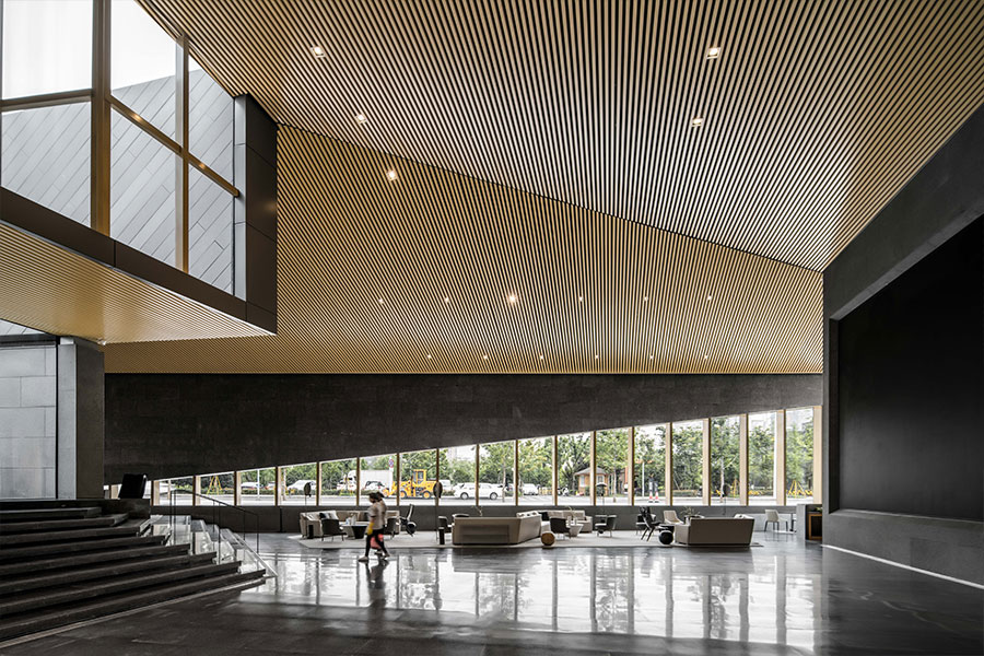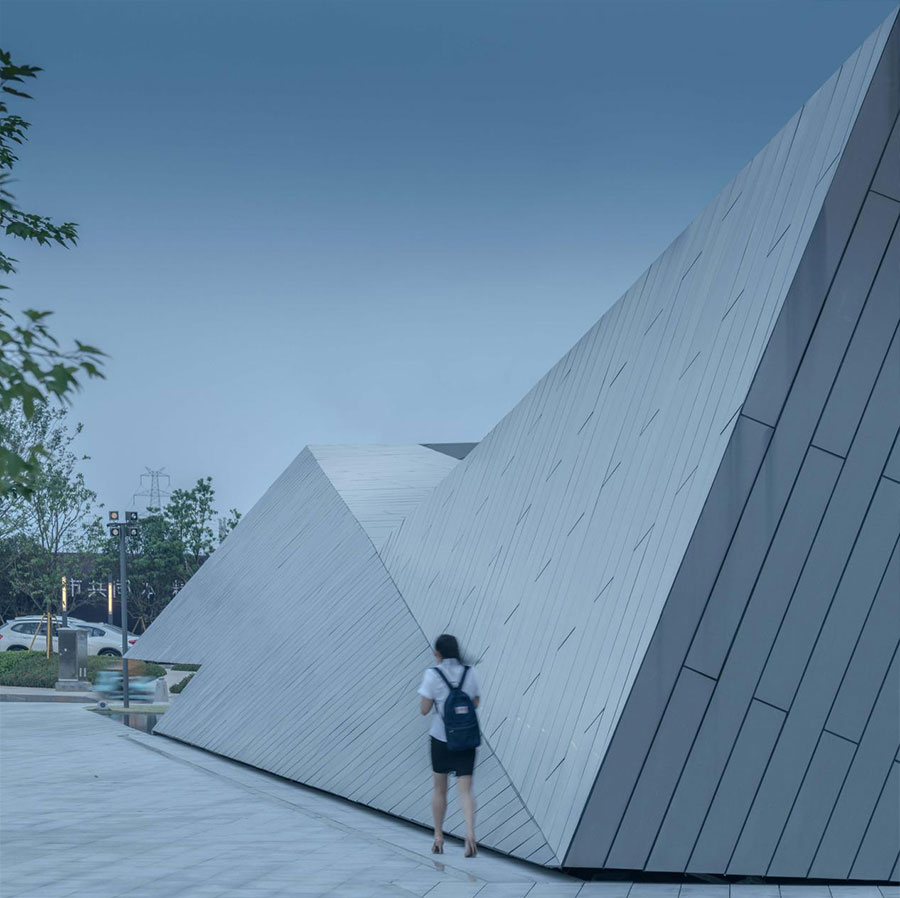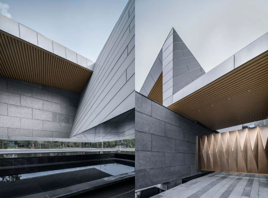 折纸外观以银灰色的钛锌板覆盖,拉丝的纹理与触感贴近折纸的意向,拼缝斜向拉伸强化外观的速度与张力。与外壳对应的内里根据位置分为两部分:内墙采用深灰色的石材,吊顶则采用木色格栅,与玻璃幕墙后的肋柱同质,与石墙一道创造柔和安定的室内感受。玻璃幕墙借肋柱受力,竖明横隐,玻璃高透低反,意在消隐,衬托建筑的雕塑感。
