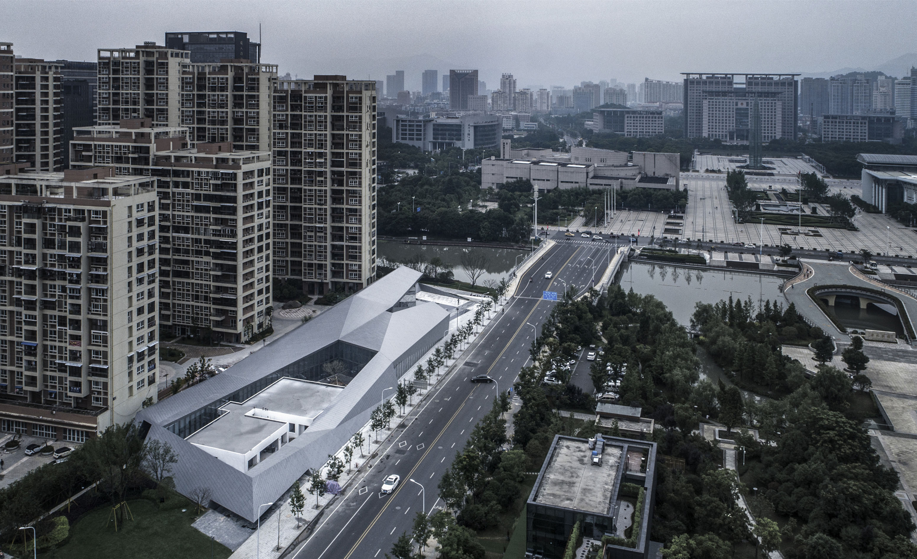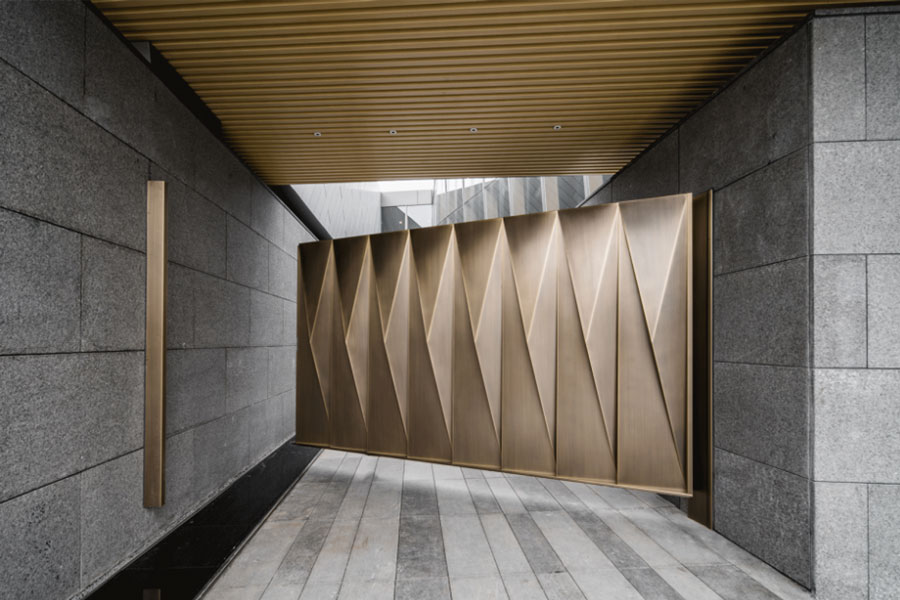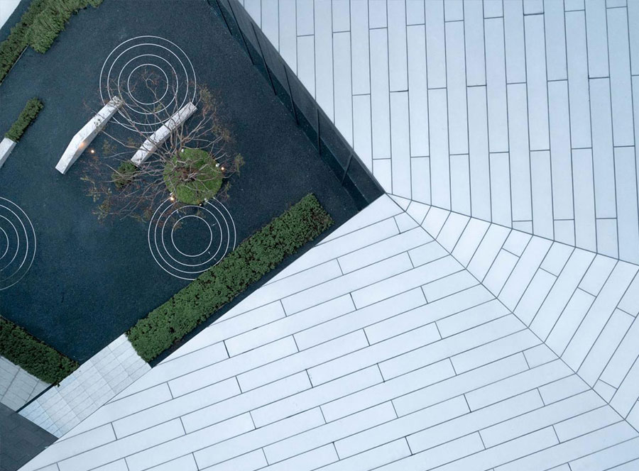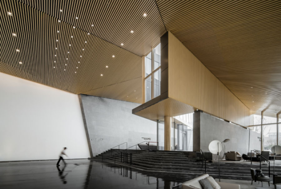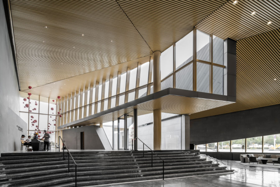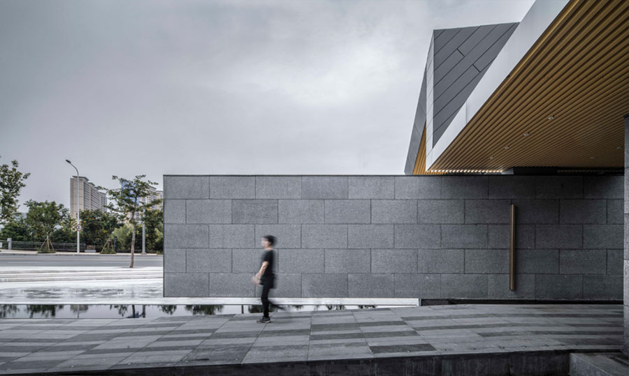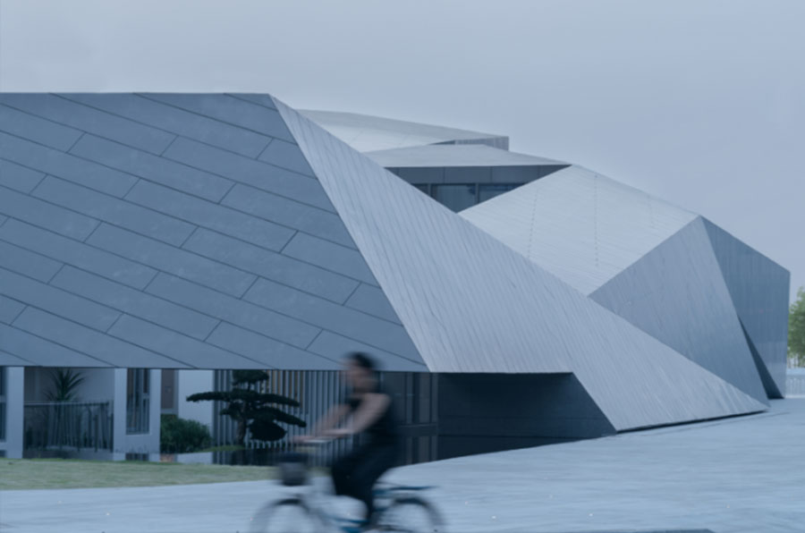 折纸外观以银灰色的钛锌板覆盖,拉丝的纹理与触感贴近折纸的意向,拼缝斜向拉伸强化外观的速度与张力。与外壳对应的内里根据位置分为两部分:内墙采用深灰色的石材,吊顶则采用木色格栅,与玻璃幕墙后的肋柱同质,与石墙一道创造柔和安定的室内感受。玻璃幕墙借肋柱受力,竖明横隐,玻璃高透低反,意在消隐,衬托建筑的雕塑感。