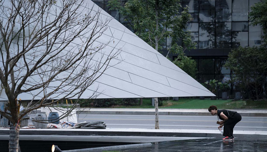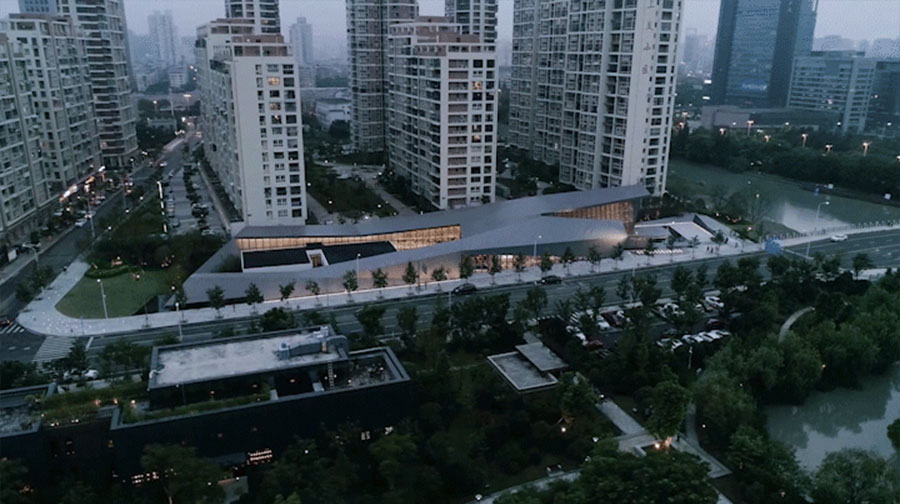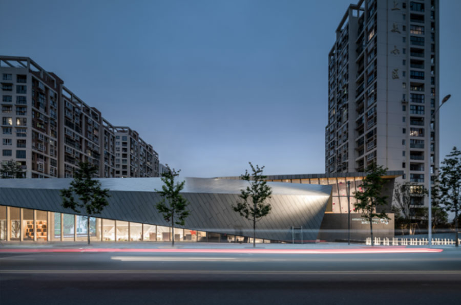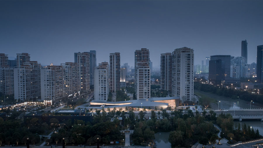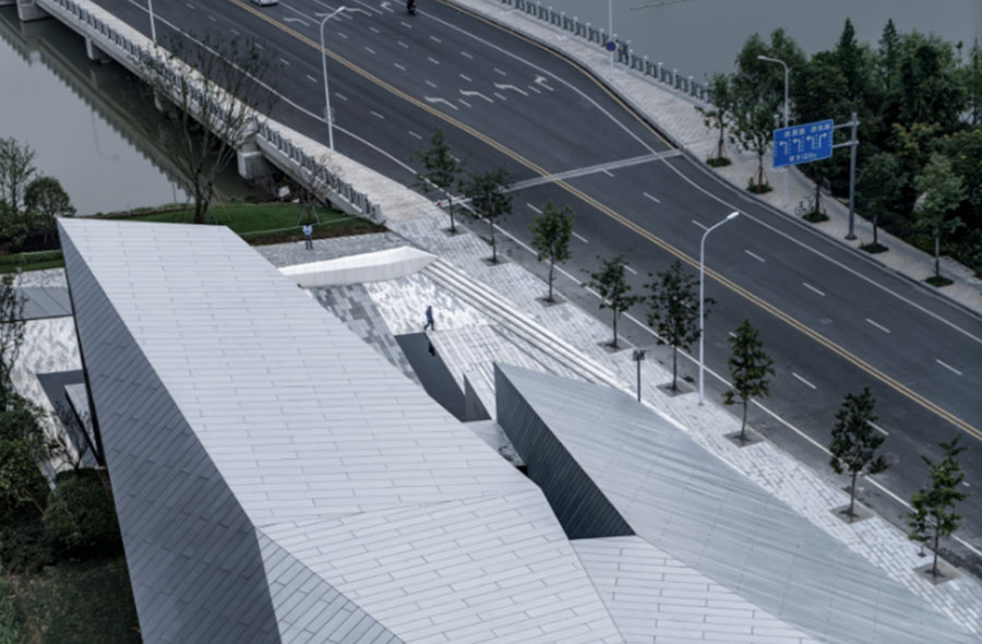 本案以折纸构成打造叙事山水,围合出无隔断的流动空间,并以城市客厅为己任积极与环境对话,尝试提升公共空间的体验与形象,以场所精神的复兴赢得新的认同感。