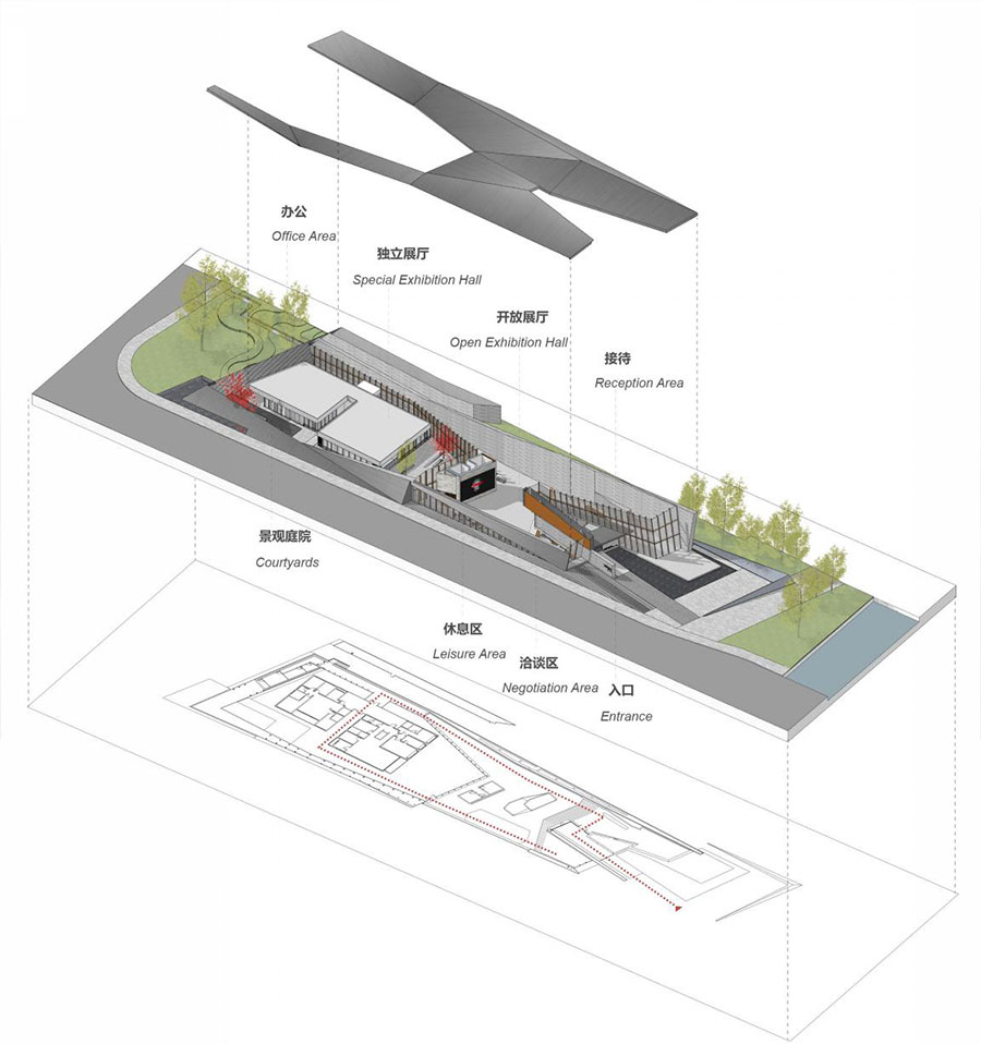 项目用地的可建设范围东西宽度30米,南北长120米,长宽比较大。从临河一端开始,前院、大厅、后院依次排开,形成建筑的整体格局。室内动线的起点与终点尺度放大,形成汇集人流的口袋,与大厅串联。大厅与后院分别设置开放展区与独立展区,驱动流线的交叉与回流。以基础回路为骨架,建筑形成了由主题展示厅、接待大厅、中央展厅、独立展厅、洽谈区、休息区组成的流动空间。