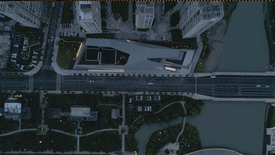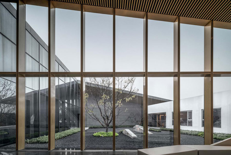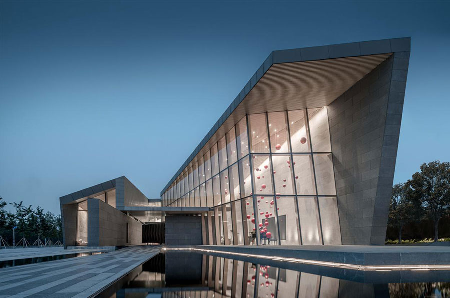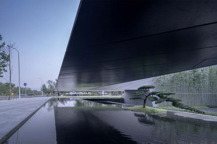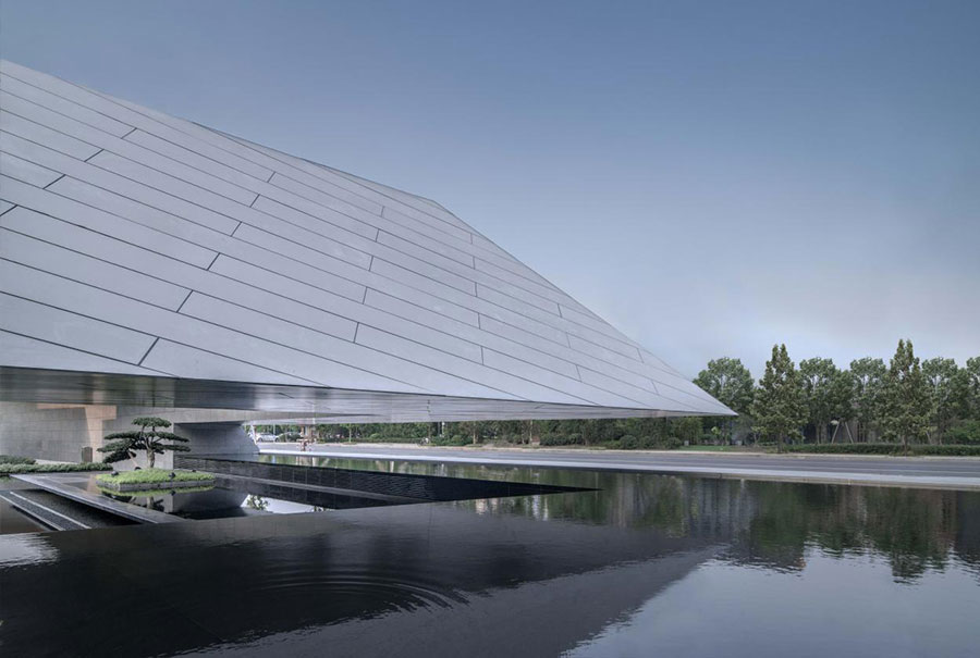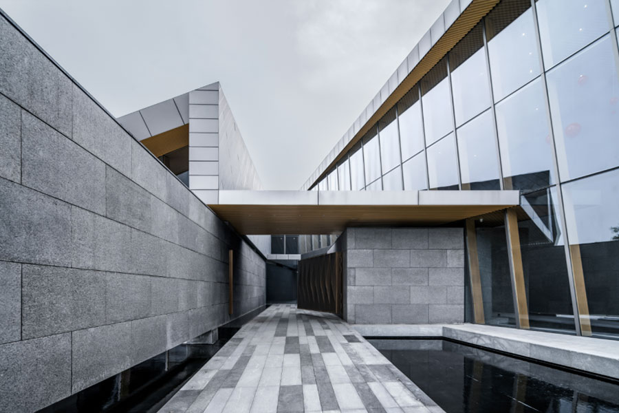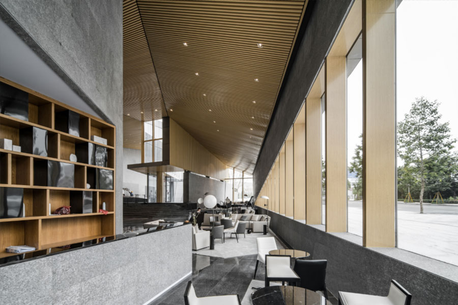 实墙从地面拔起又折向天空,勾勒出山崖的轮廓,玻璃幕墙如水帘从檐下垂向明渠汇成山脚的湖泊。