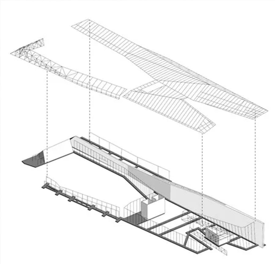 整个建筑像一个巨构的折纸工艺品:一张纸经过裁剪翻折,形成了连续的表皮与空间。事实上这样的做法,在形式上消解了墙和屋顶的界限,在空间组合上使隔断甚至柱子对空间流动的性的影响降到最低。当然这也对结构与幕墙设计提出非常规的要求。