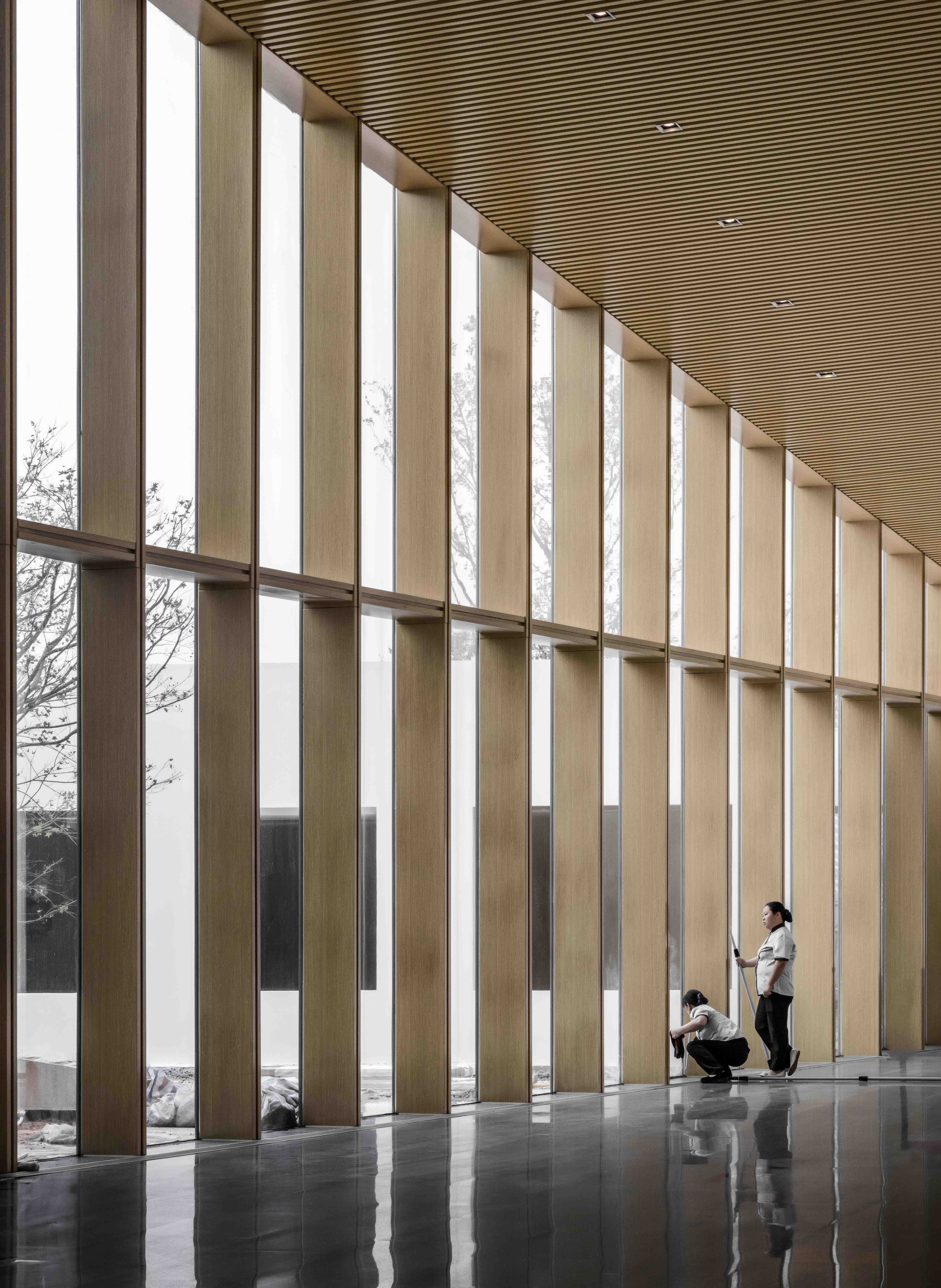 石径徐来,山门顿开。沿着石桥,穿过山门,时间在前院短暂停留,互成角度的边界将人的注意力向前牵引,透过玻璃屏障,大厅与人初次照面。而夸张的高宽比却压抑着膨胀的好奇。