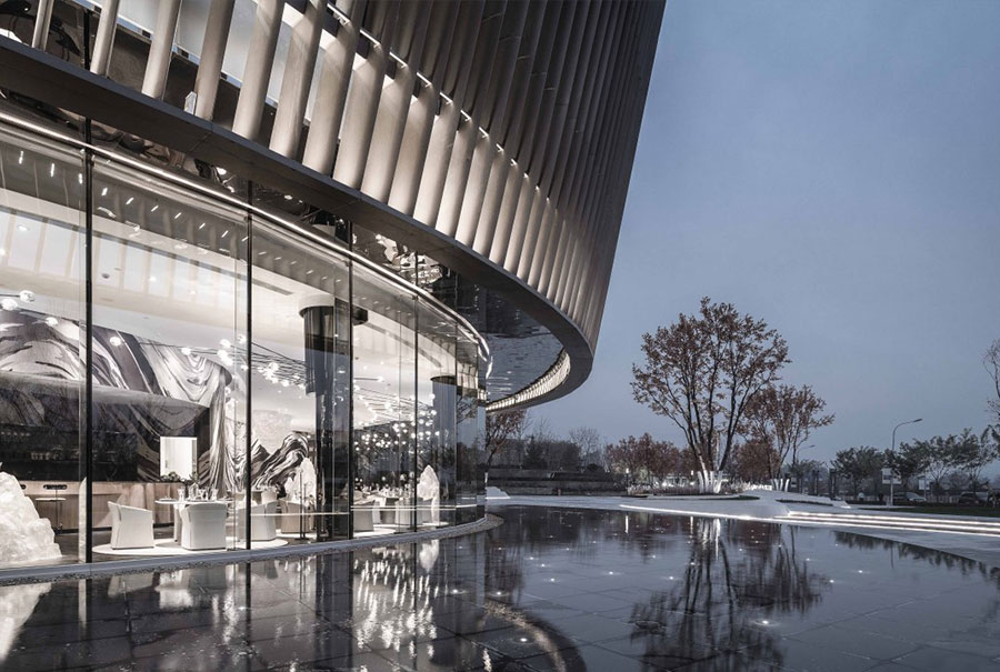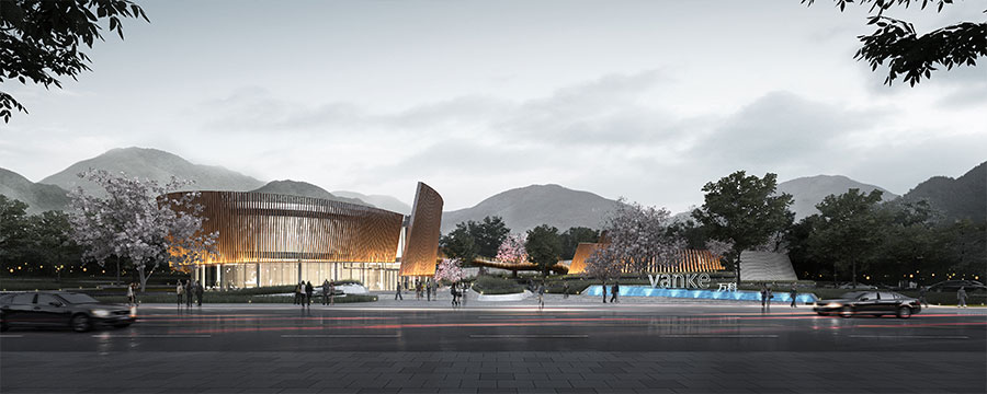 在这个项目中,商业地块和山晓剧场是靠山这边,跟山去对话,让它更紧密、更时尚、更现代、更纯粹一些。到居住社区,偏向于城市过度了,偏居住形态,一边在城市之中,一边在浅山之上,从而很好的把文化、商业、社区做了一个平缓的地势过渡,实现浅山有语、城市有声的状态。