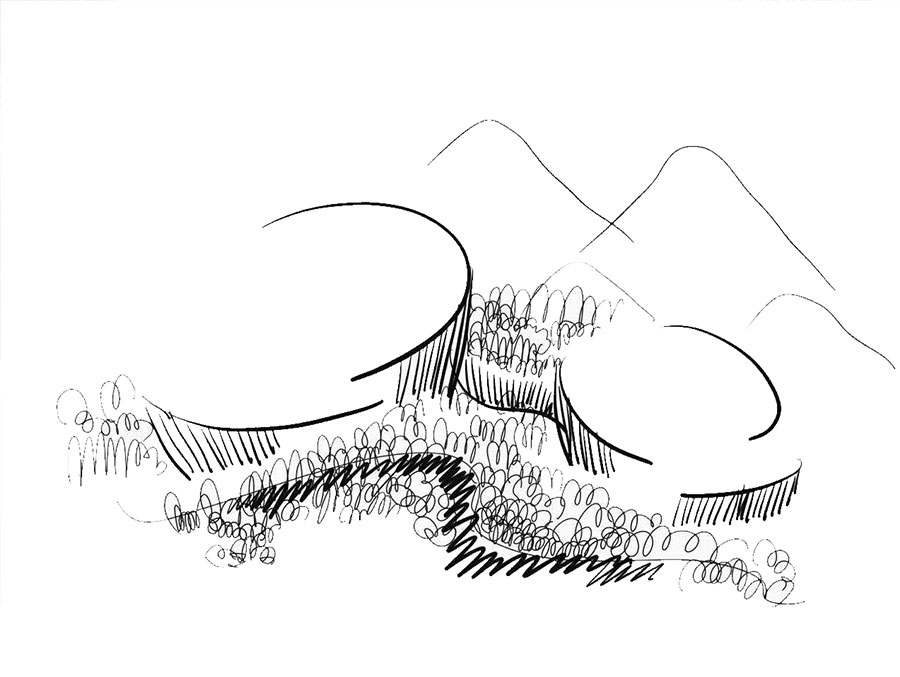我们希望这一片山野中,有一个很未来感东西能够落到这个商业区,就像一个太空的不明物体,落在了一片田野中,可以作为我们与未来的一种链接,连接后面的商业片区坡地的建筑形态,带动起一个比较生态的商业环境,达到一种人文形态的形式感的实现。