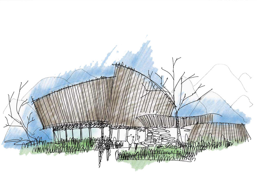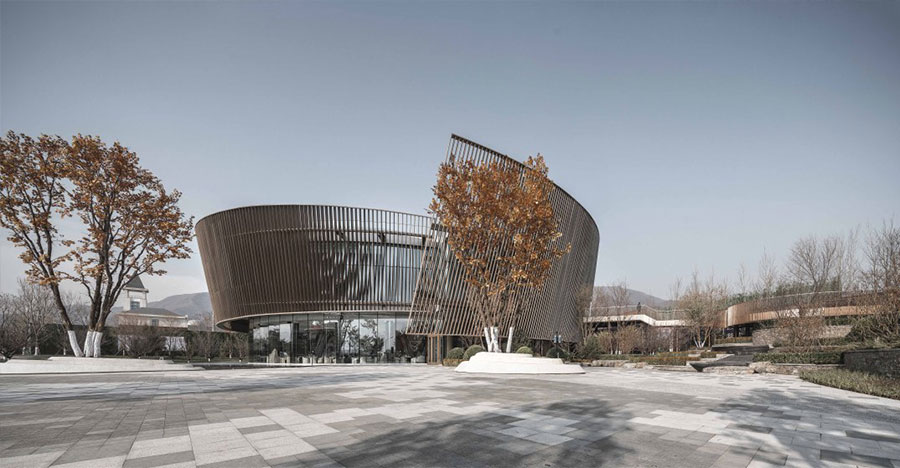 螺旋上升的表皮活跃了整个外立面,形成了整个建筑的视觉焦点,也使得我们的建筑不像传统几何圆形那么生硬,多了一份秀美。同时又恰到好处的和远山形成了呼应,这种若离若合的和谐正好符合浅山区域的一种生活气质。