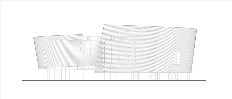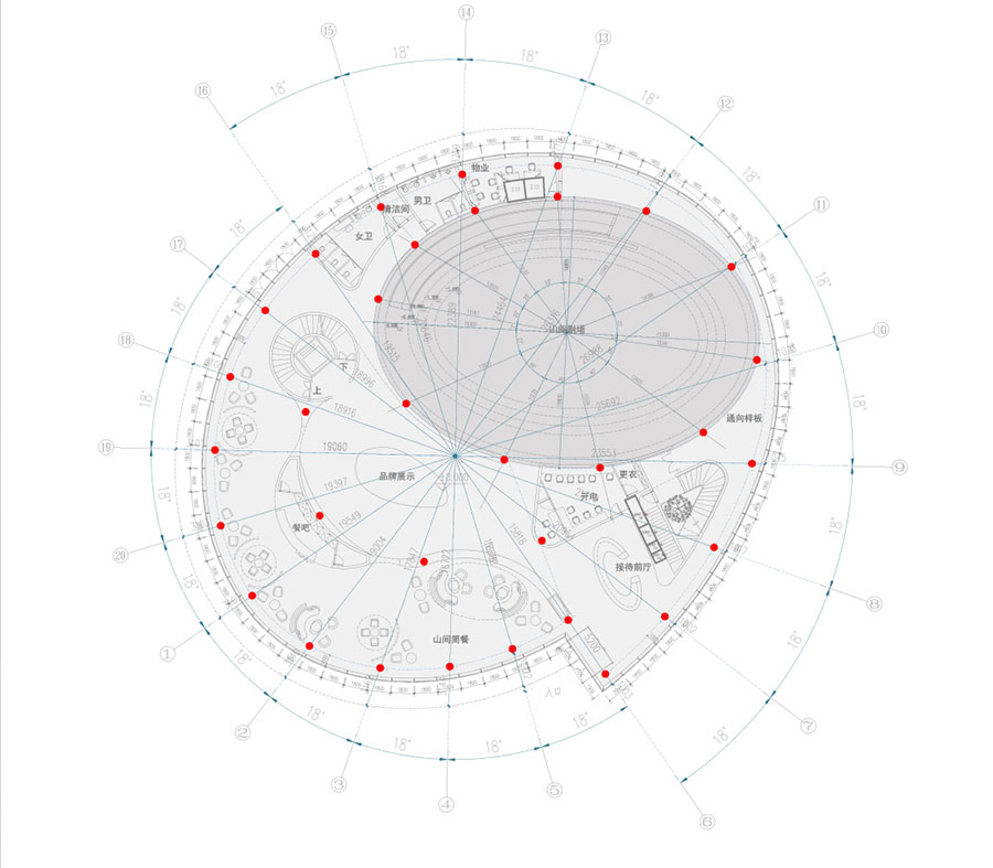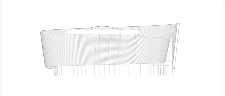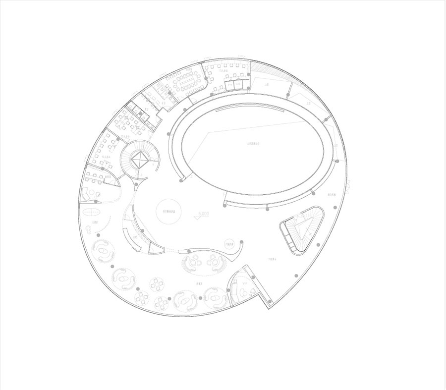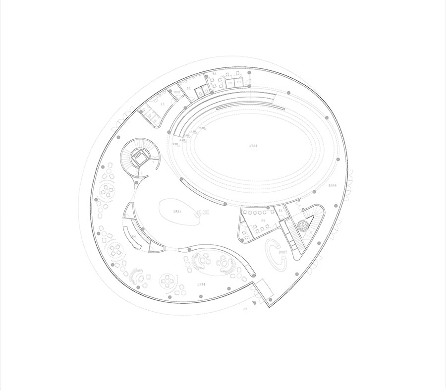 我们的平面巧妙的利用了两个椭圆,一个小椭圆包含在一个更大的椭圆之中。特地旋转了小椭圆的长轴,使得小椭圆和大椭圆形成一定的冲撞,这样形成了我们需要强调凸显出来的中心核心剧场。