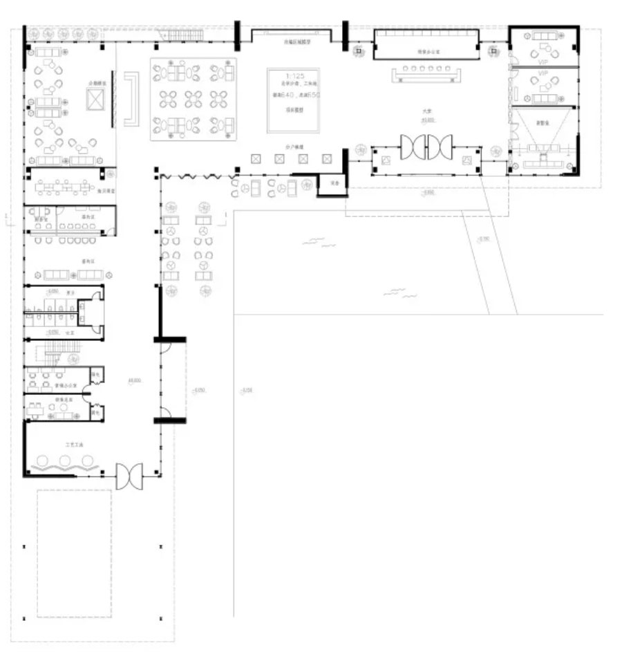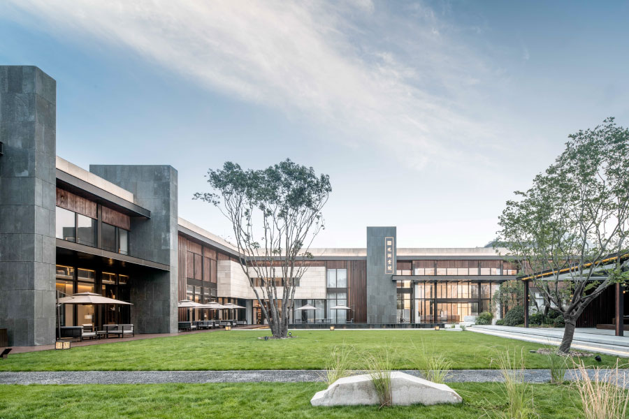 整个建筑场地的设计参考了园林的设计,从林荫大道、门头到主体建筑、观景廊,再到样板间、茶室等——空间序列起承转合、收放有度。路径的设置也符合园林的手法,门头掩映,叠山理水,移步易景。人置身其间,随着时空的推进,感受到的是丰富而有节奏的空间。
