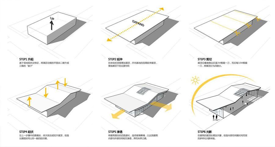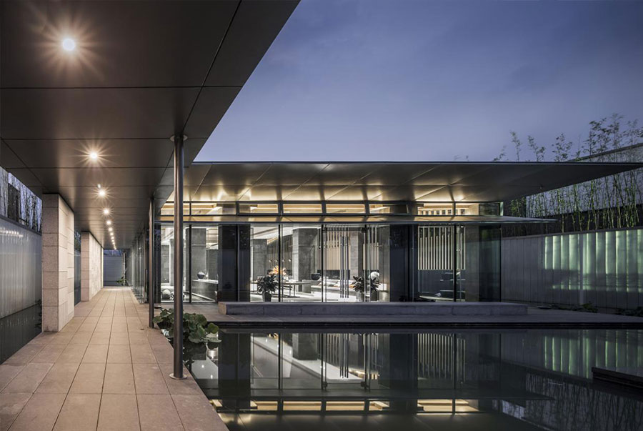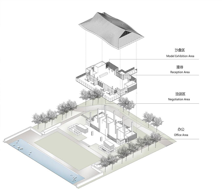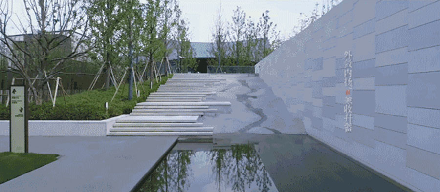 如果说通透的玻璃表达的是若有若无的朦胧,那起伏的屋面则是述说着见山不是山的禅境。一虚一曲将传统山水画中的墨画蕴意、水乡淡雅,演绎的更为传神。