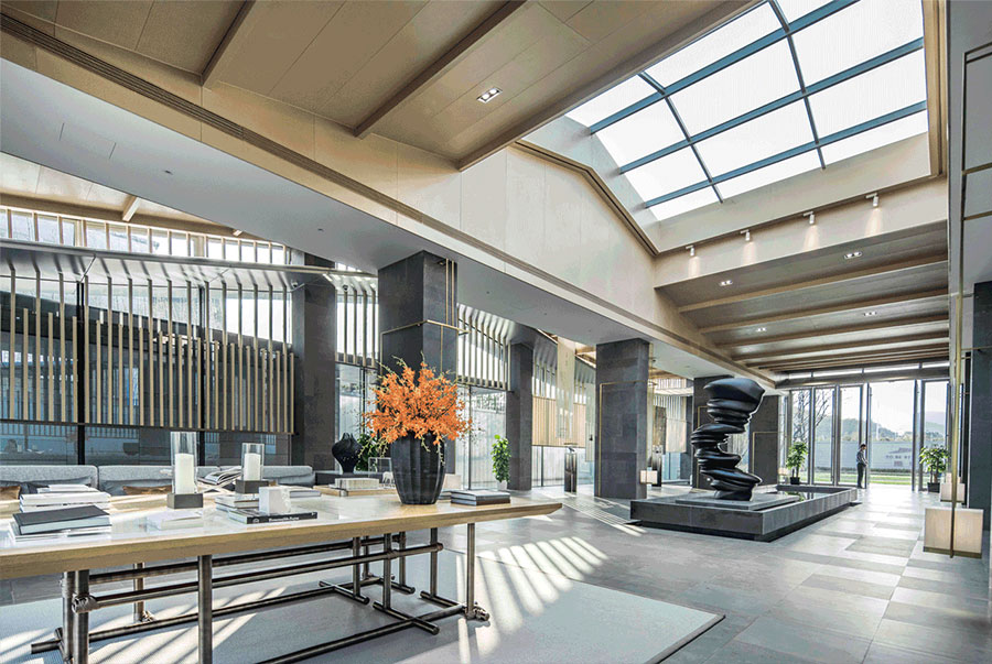 第五立面的设计一直都被认为是中式建筑的精髓所在。在大堂建筑的设计中,我们以起伏之形回应山峦变化,采用了钢结构形式的金属屋面。保证屋檐曲率的同时,达到了出檐深远、屋面轻薄的观感体验。
