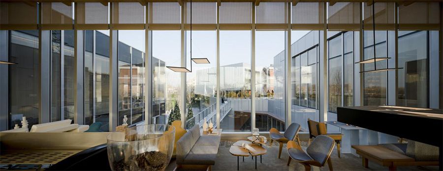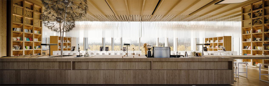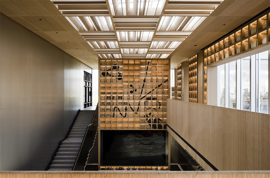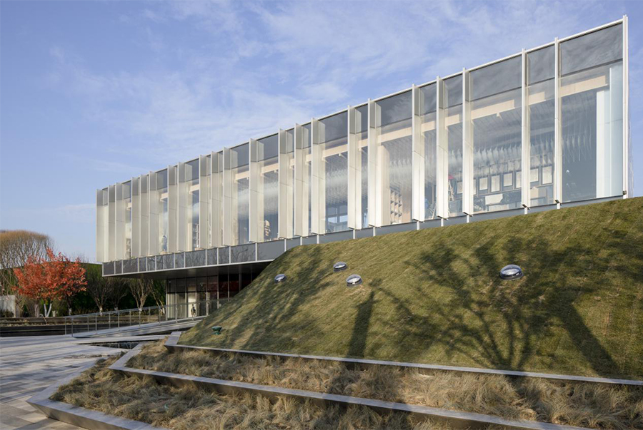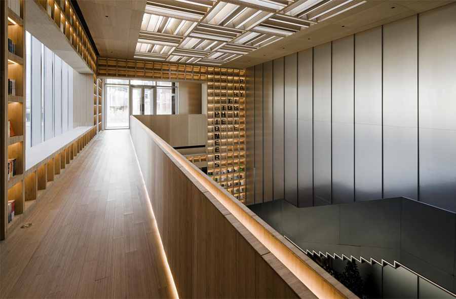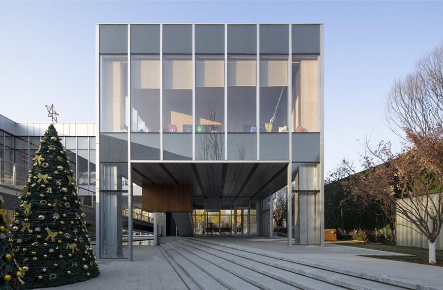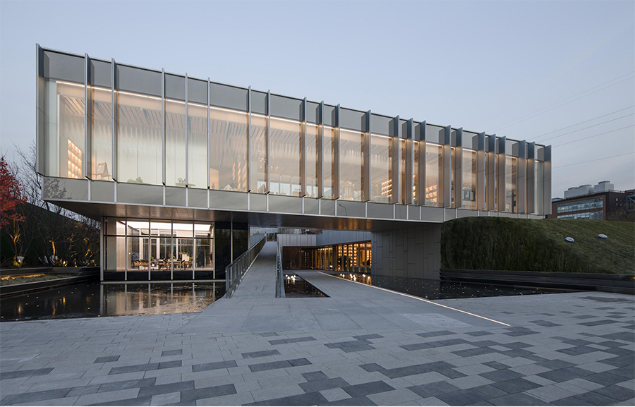 建筑主体采用钢结构;由浅灰色铝板,配合超白玻为作为主立面效果,局部添加Parklex木板作为点缀;不同材料的组合,强化了空间的本质,干净利落的竖向分缝的处理手法,让建筑愈加纯粹自然,错落式横向线条,隐喻书架,呼应建筑主体。由清冷的铝板和玻璃,温暖的木纹板和草坡所共同构成的建筑,干净纯粹而又充满变化,完成了现代科技感和自然亲切感的相互交融。超白玻和铝板在不同的光线下,对周边环境也形成了丰富多变、深浅不一的反射效果,形成了建筑对环境主观的反映和融入。