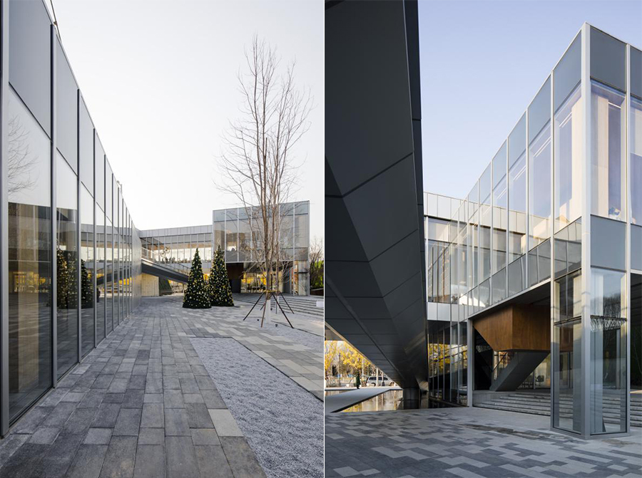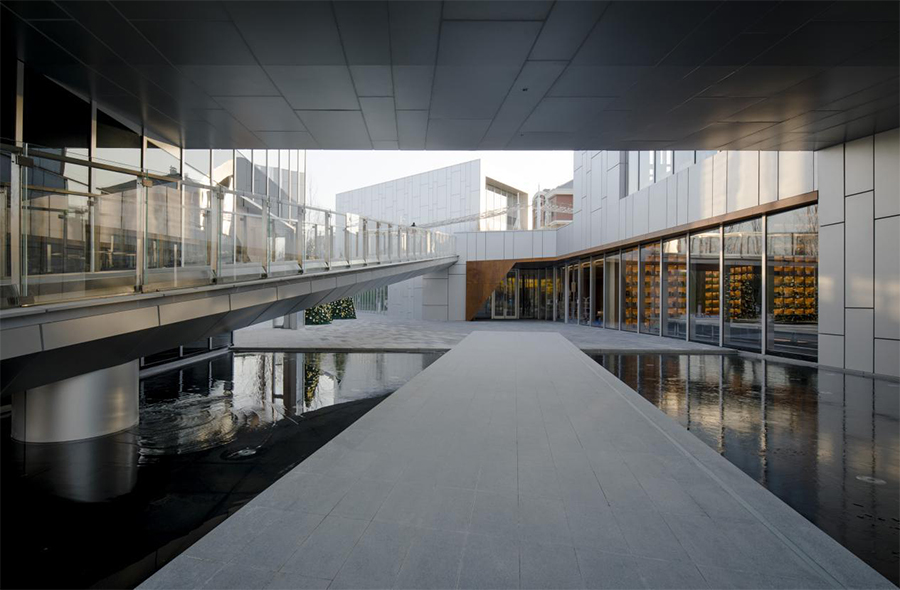 半围合式的建筑,是天空的画框。天空与地面,自然与建筑,光与影,相互对立也相互依存。建筑表面的玻璃和铝板,柔和地映射着天空的颜色,平静的水面再将建筑和天空一同纳入其中,层叠反复的光影反射让建筑的边缘和界限模糊起来,平静而又仿佛充满诗意。