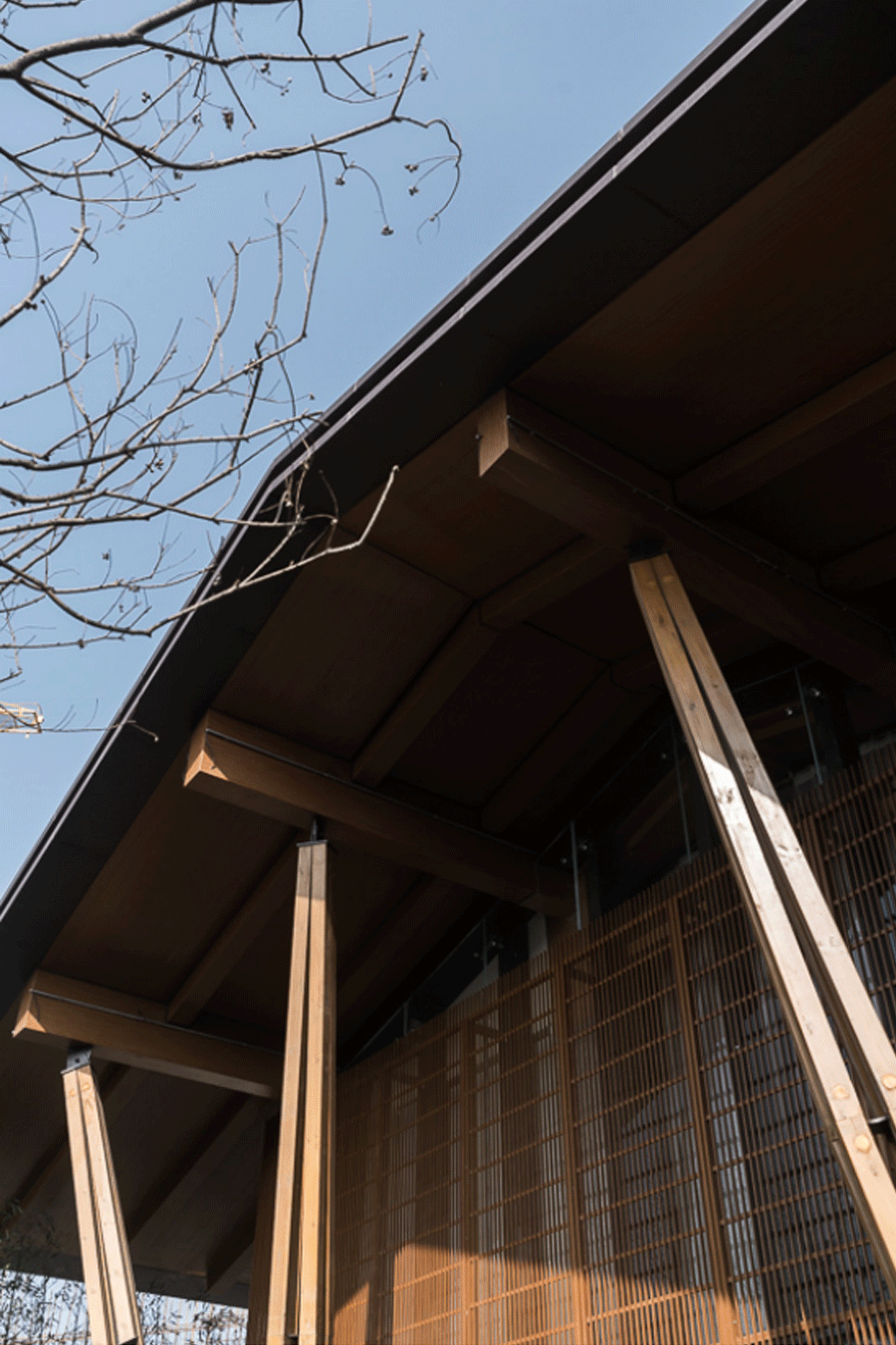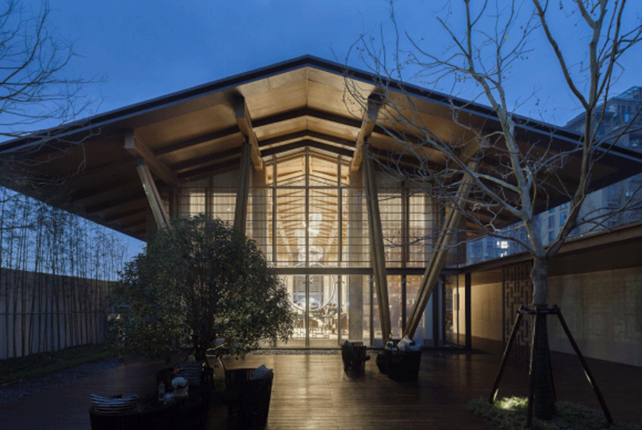“南方建筑为棚,多敞口,以敞口之建筑,配茂林修竹之景,园林之始,于此萌芽”大尺度出挑的屋檐,和大面积开敞的立面营造出十足的空灵感。屋檐下的举架、椽子和立面上的木色屏风打破了建筑的体量感,使建筑轻巧、富于流动性,弱化了主体建筑使整个群体空间更加统一。