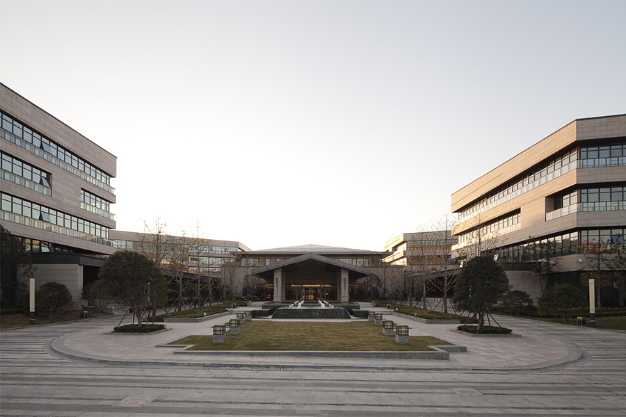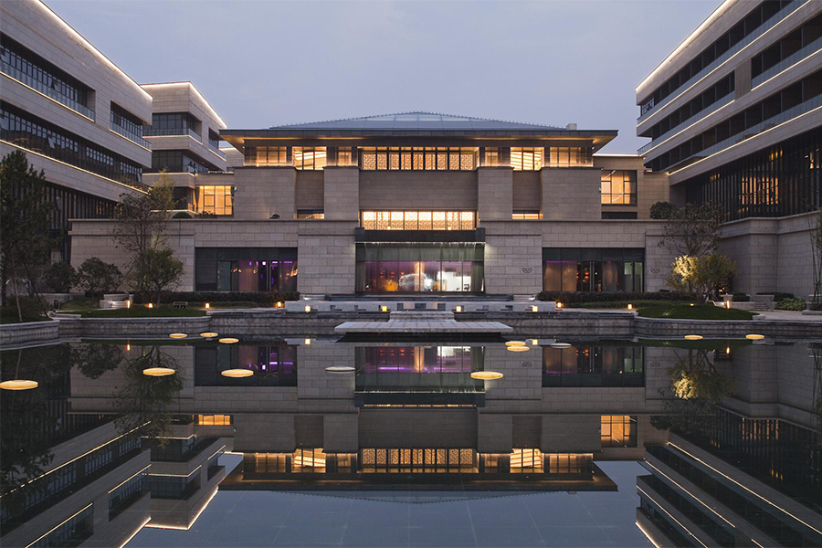 其中盛美利亚酒店总建筑面积8.5万平方米,客房400间,从曲江池西路经过两侧游廊环抱的入口花园进入,是酒店的核心区域“光影中庭”,这里包括的大堂吧和交往休憩的空间,也是感受一天中光线变化的光影大堂,晚间坐望月光湖景,更是别有一番情趣。结合西侧跌水平台在主轴线上形成了“入口庭院--光影大堂--后花园--跌水景观--湖面”的多层次景观轴线。