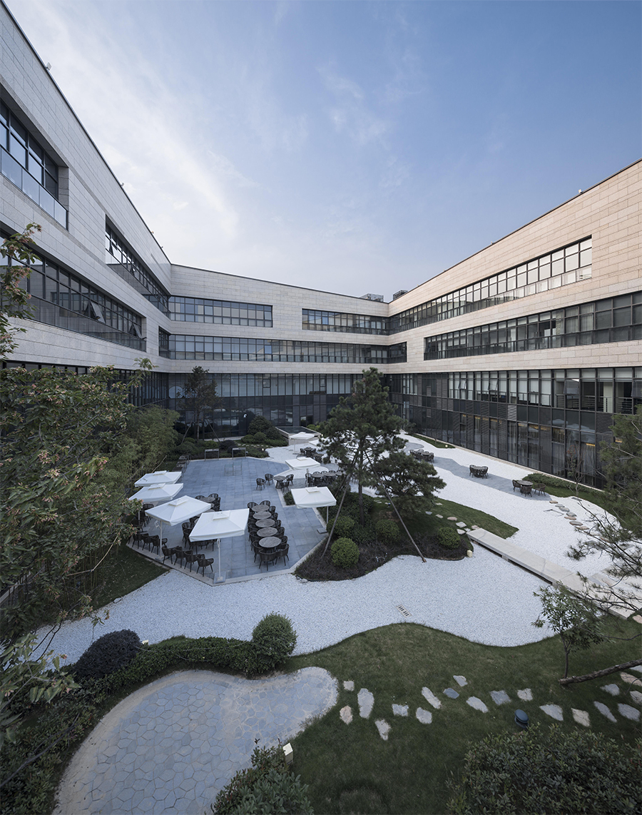 酒店的主要功能布局,包括北侧的宴会厅餐饮部分和南侧的客房区域,则围绕中庭大堂蔓延展开,建筑通过形体的扭转与围合形成四个里坊单元,并各自形成半封闭庭院空间,游客动线则围绕花园游廊水平伸展,形成了次级景观轴线,主轴线的空间秩序和次级景观的自由变化,正是体现了中国传统建筑中多模块化、多层次、重布局的营造精神。