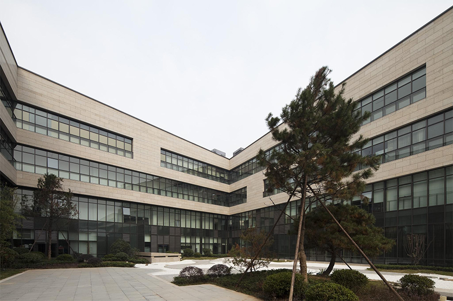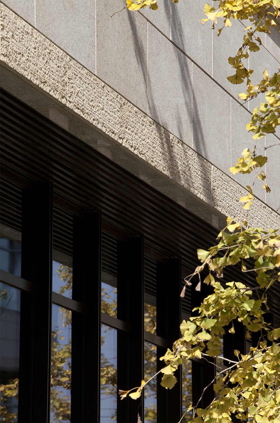 酒店的立面采取了审慎的态度,水平的构图感并无太多奇异之处,虚实错落的母题贯穿整个外墙始终,对城市街道而言展示出一种封闭连续的界面,而对于内部空间则表现出一种里坊式的围合空间,来容纳花园、水系及其他公共空间。立面的材质以米黄色花岗岩石材为主,与场地浑然一体,石材的拼挂方式以城墙的城砖为主题,宽窄变化以及局部的机切面条纹则暗示了斑驳与自然的岁月感。整体简洁有力,更像一部巨大的雕塑,给与从大唐芙蓉园走出的游客一种耳目一新,又似曾相识的印象。