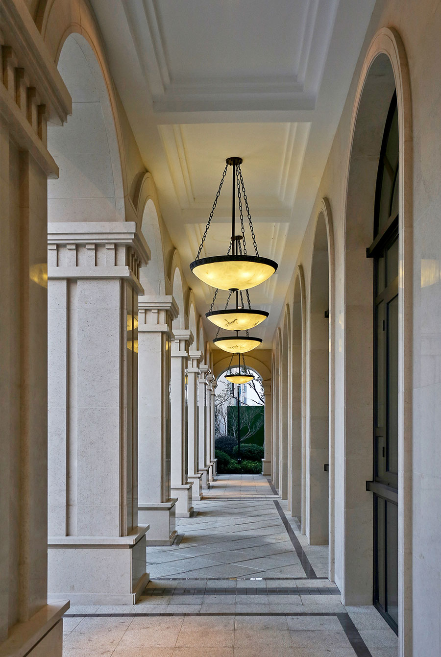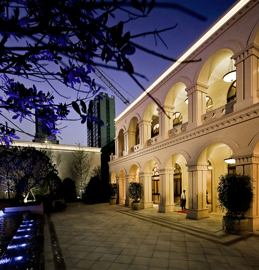会所前广场着力营造入口前区的场所感,在夜景灯光的渲染下,半圆形拱廊的优雅气质默默的散漫开来。