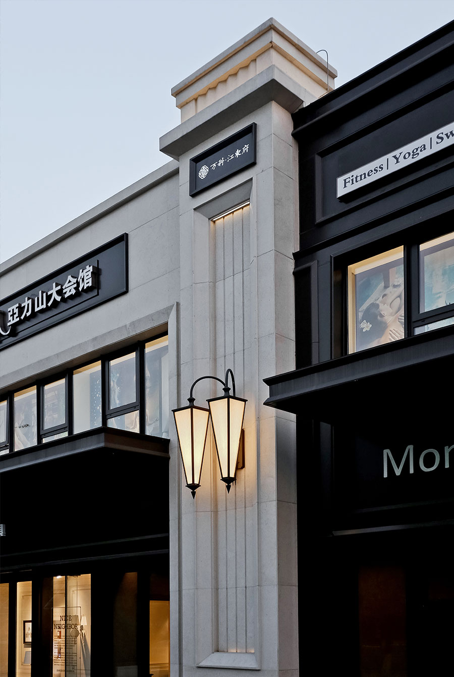 白色砂岩的高贵质感与深色铝板的稳重气质,在暖黄色灯光的指挥下,与冷白色的商业LOGO一起,诉说着独有的生活氛围。