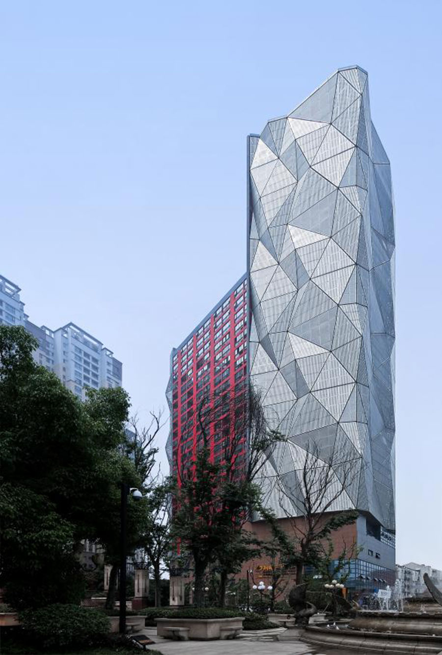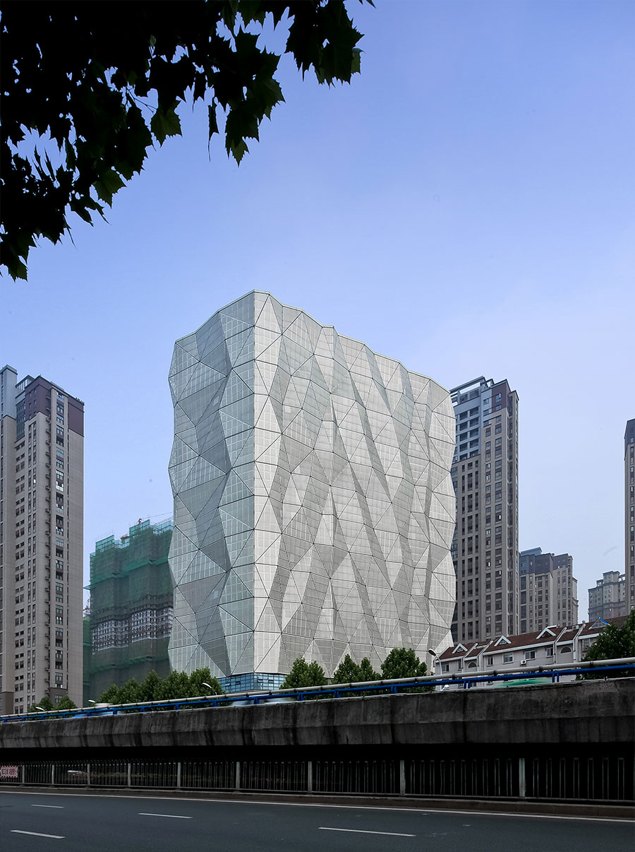 几何折叠的穿孔立面颠覆了传统的建筑外观,成为该大楼最具标志性的特点。灰色的不同孔径的穿孔铝板表皮与周围的环境融为一体。立面根据不同时节、不同时段、天气及光线的变化呈现不同的特点。每当暮色降临,灯光从铝板上的穿孔中透过,就描绘了一幅繁星满天的夜晚画面,使建筑自身获得了独有的特点和非凡的可塑性,并捕捉到了建筑基地的动感与独特的场所记忆。
