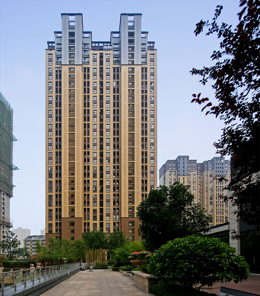 整个建筑外表是层永久性的铝合金骨架,当人们处在一定距离时,窗户本身就不会十分明显,取而代之的是阳光下发光的一系列立体三角金属网架。网格结构表面非常细腻优雅,内部构造十分结实,三角形的几何元素赋予建筑一个强有力的外部形象。公寓楼隔离基地与北侧的高架,因此我们考虑充分发挥穿孔铝板的吸声作用,且材质具有自清洁无光污染,符合城市地标形象。