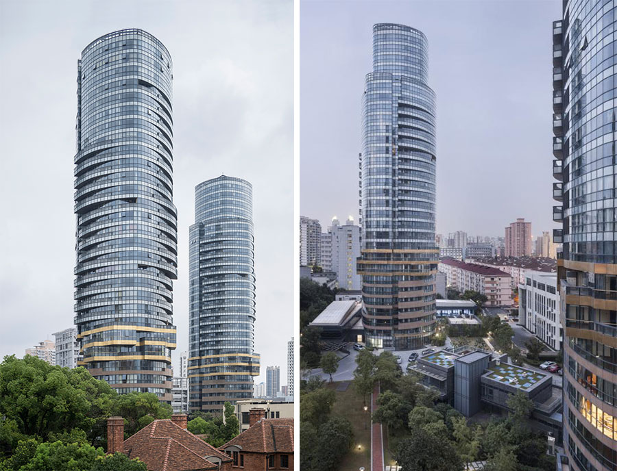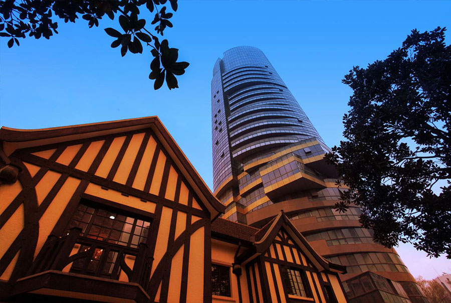 我们对保留下来的别墅进行修建性保护,对这批上海殖民地时代的优秀历史建筑加以修复、还原,以唤醒其昔日神韵。为最大限度地减少对新建筑的影响,我们采用全玻璃外墙面,建筑形象挺拔高耸,设计的点睛之笔在于顶部玻璃幕墙的向上延续,塔楼宛若天梯直上与蓝天融为一体。我们希望以此淡化建筑的体量,减少形体对于周边环境的压迫。整个玻璃雕塑不仅代表今日上海的国际形象,更为重要的是对建筑美学与时代特征的有机结合做出了我们的展望。