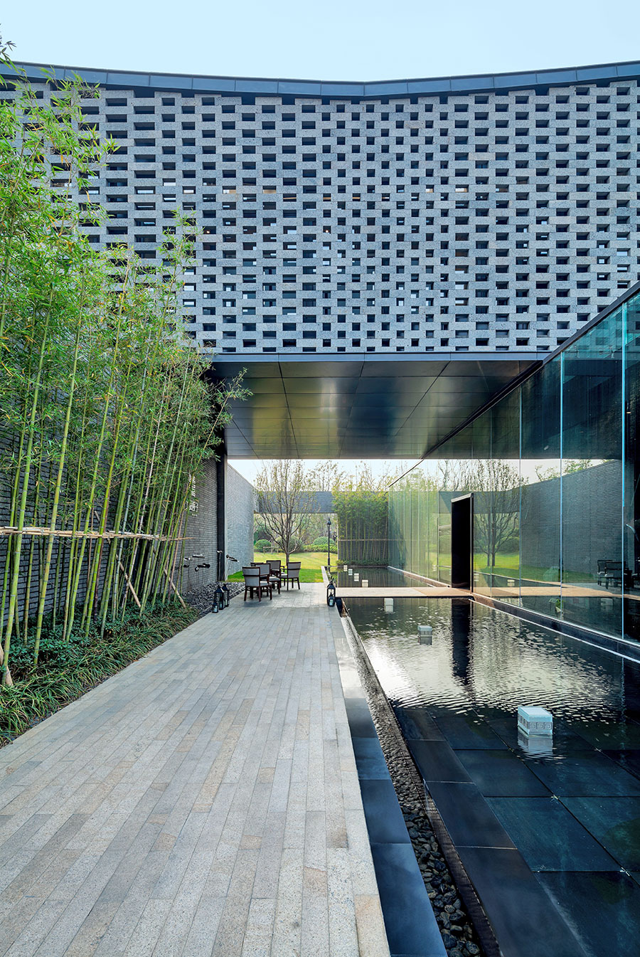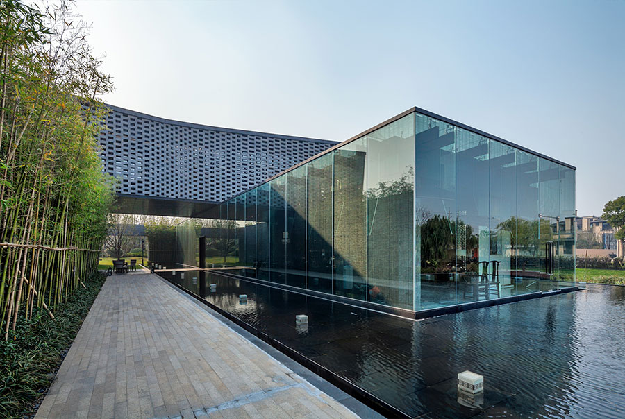 建筑材料语言的诠释:首层采用纯玻璃肋幕墙形式,通透整洁的墙面映在水面上,增加了宁静的感觉,二层采用镂空砖墙的形式,厚重的立面形式给建筑带来稳重感,也给室内带来奇幻的光影变化效果。二者的结合,强烈的虚实关系对比则给建筑带来了活力。