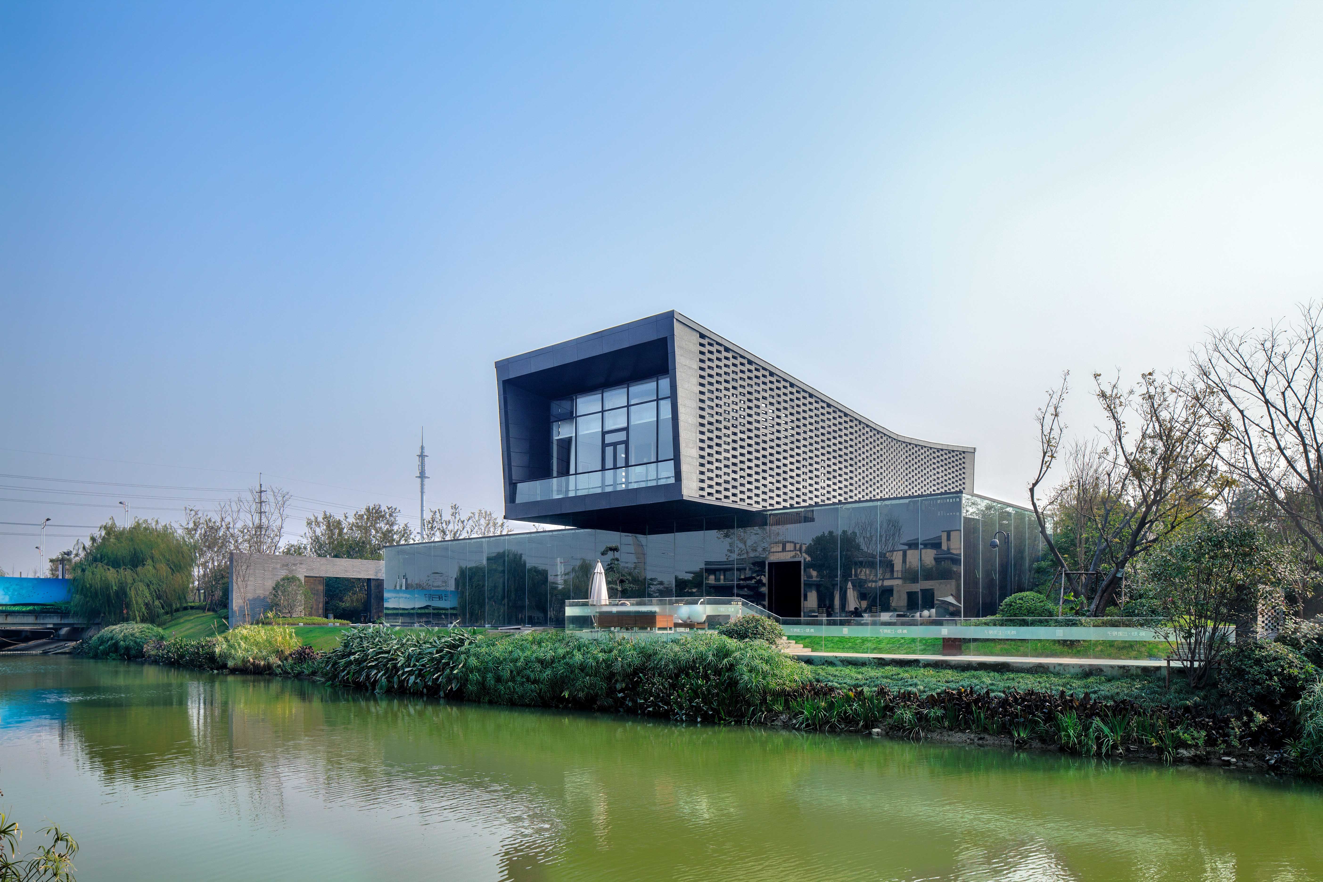 建筑采用现代建筑风格,并运用体块穿插手法,虚实对比处理从而达到强烈的视觉冲击力。主体周边的水景,及深色院墙则给建筑带来片刻宁静,院子文化在这里得到诠释。