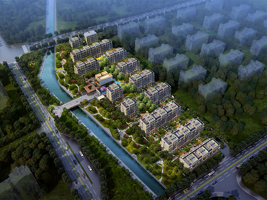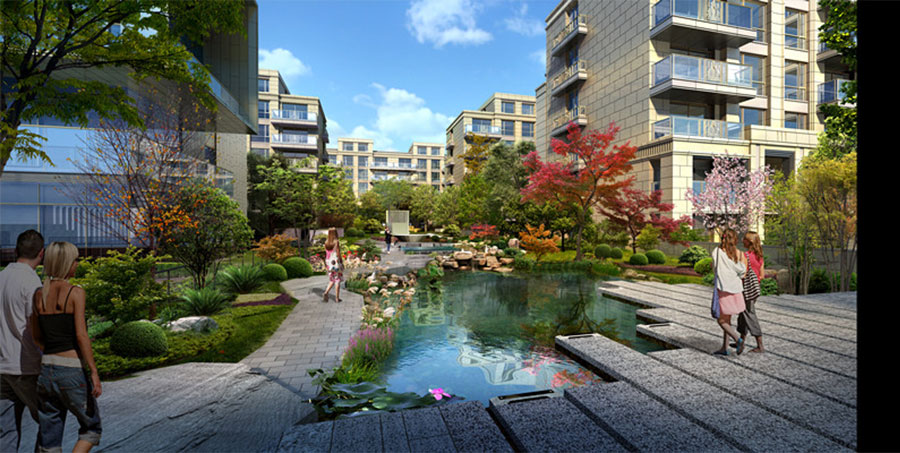 小区西侧的河流是整个小区景观体系有利的先天条件,另外还有地块北侧公共绿地景观,小区组团内部围合出中心景观,共同构成小区的景观体系。在不同的设计发展方向中,我们或营造小尺度宜人的里弄式景观环境与多层组团,亦或是营造大尺度的开阔的景观空间于各个组团之中,总之建筑组团相得益彰,空间上变化丰富,充满趣味。