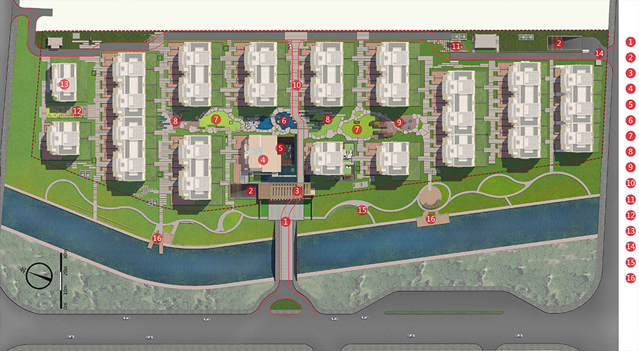 小区有三个出入口,一座优雅的桥连形成小区的车行和人行主入口,南侧设有供小区内部使用的地下机动车车库出入口,车辆由此进入地库,不经过小区内部地面。主要步行流线由西侧的桥引入小区内部,在区内形成环路,减少了车辆对小区环境的影响和绿化的破坏。组团中心区域为完全步行系统,住宅与景观轴线,小区服务设施以及公共活动空间之间得到很好的贯通与联系。