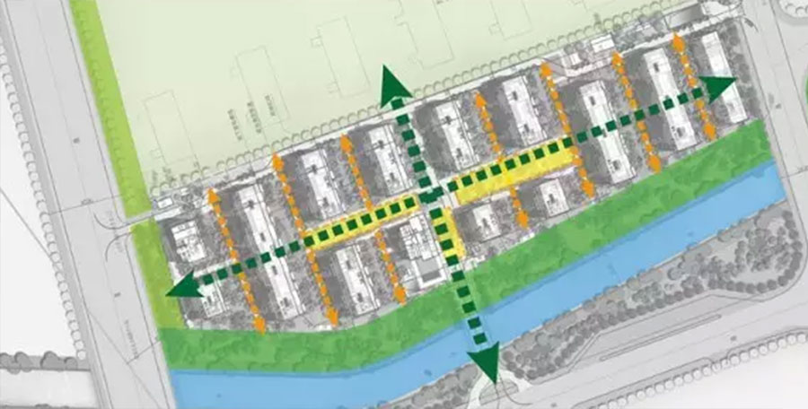 嘉宝前滩后院项目座落于上海市浦东三林板块,靠近中环内侧,紧挨地铁六号线,交通便利。地块形状呈狭长型矩形,中部略宽。南北两面皆临道路,南侧面对道路丁字路口,西侧有昔阳河分支南北向流经,将基地与云台路相隔,形成宽达60-80米的绿化带,自然条件优越,东侧毗邻万科五阶坊,那么如何合理利用周围景观资源,有效规避噪音影响,处理好建筑与水系的关系,处理好和周边小区的关系成为规划建筑设计的重点。