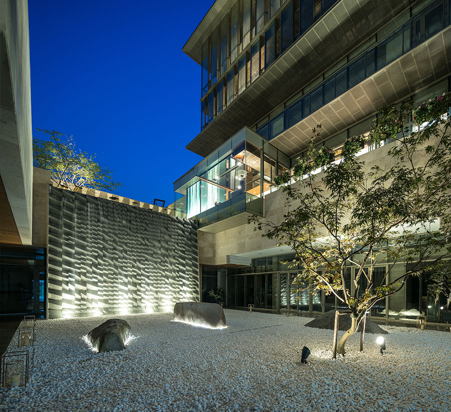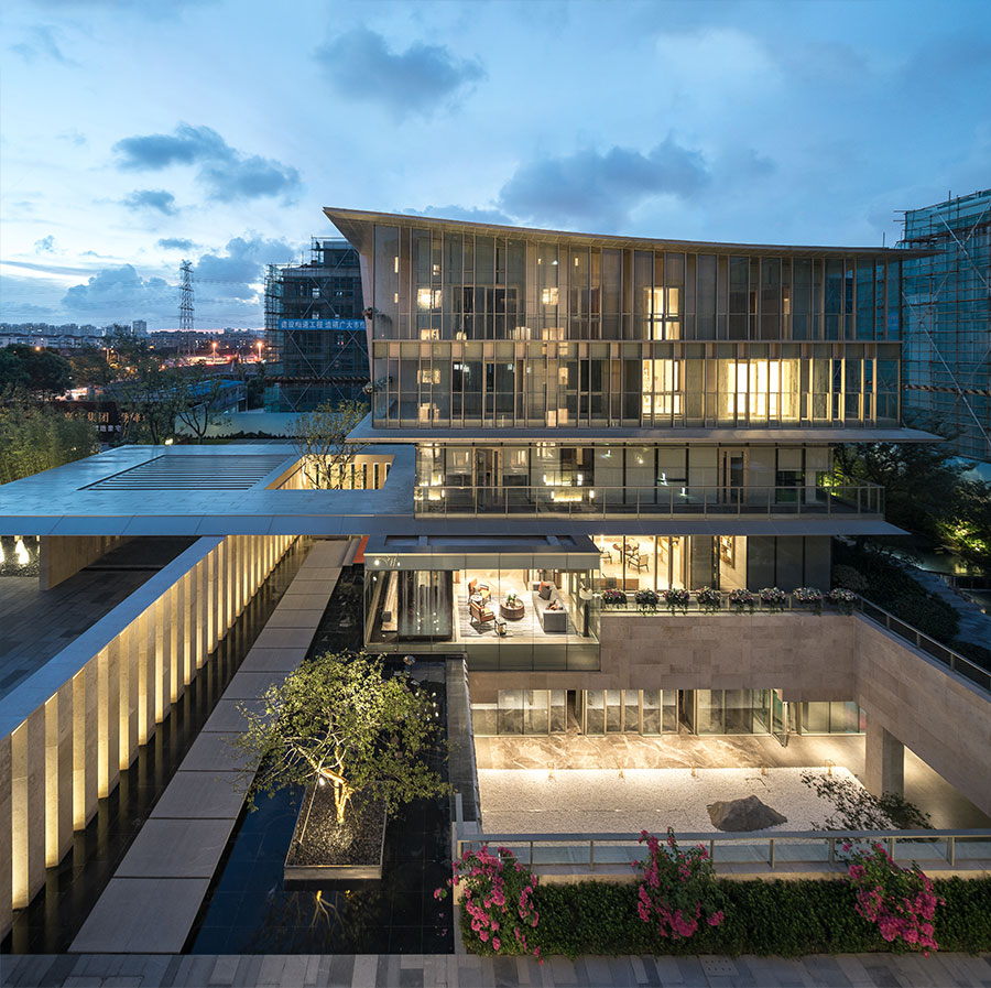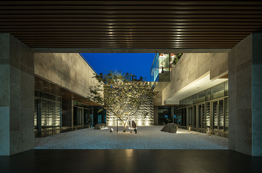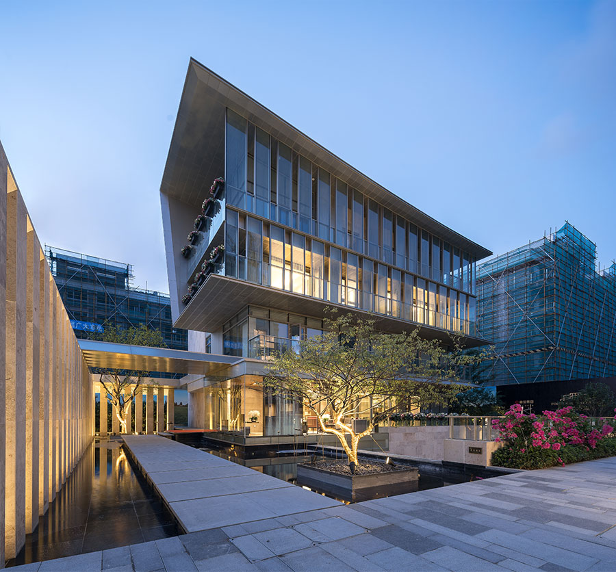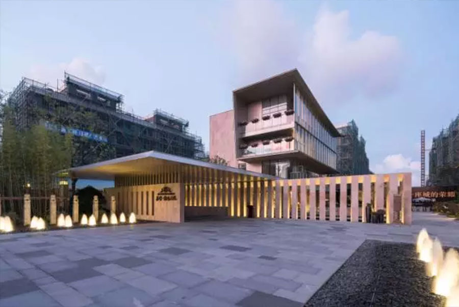 项目会所结合主入口设置,起到了梳理人车交通及入口形象展示的重要作用。在设计中,将入口空间序列营造出东方园林特有的“起、承、转、合”,为前滩后院具有现代中式氛围的高端项目品质做出凝练精彩的展现。