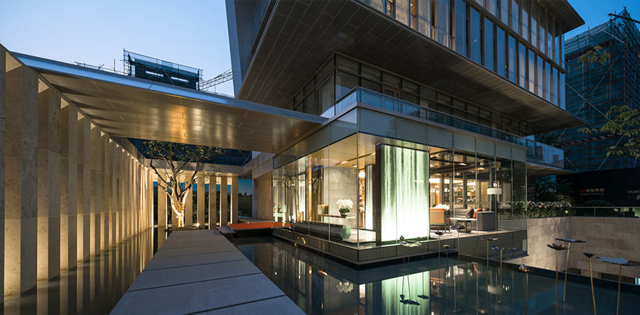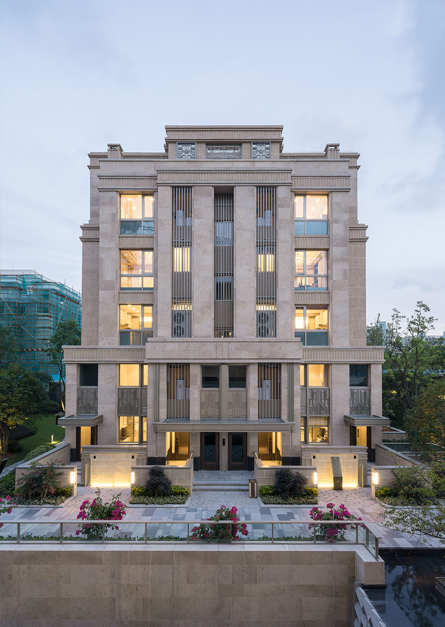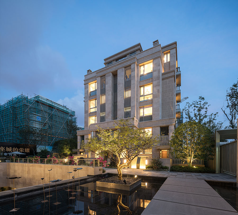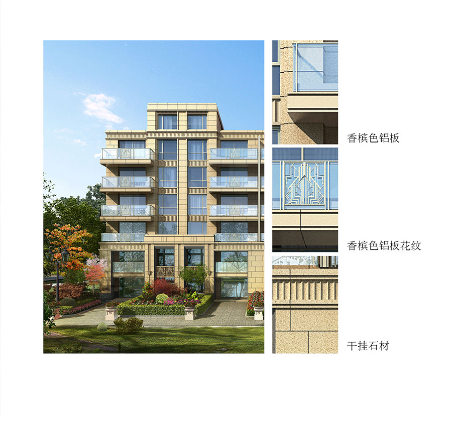 本项目为新古典主义立面风格,在设计理念上强调永固及情感温度(以石材为主)、工整厚重又不失细节,以石材、玻璃、金属(铝板)的材质对比突显细节的品质感,形体低调不张扬,成为传世豪宅的典范。