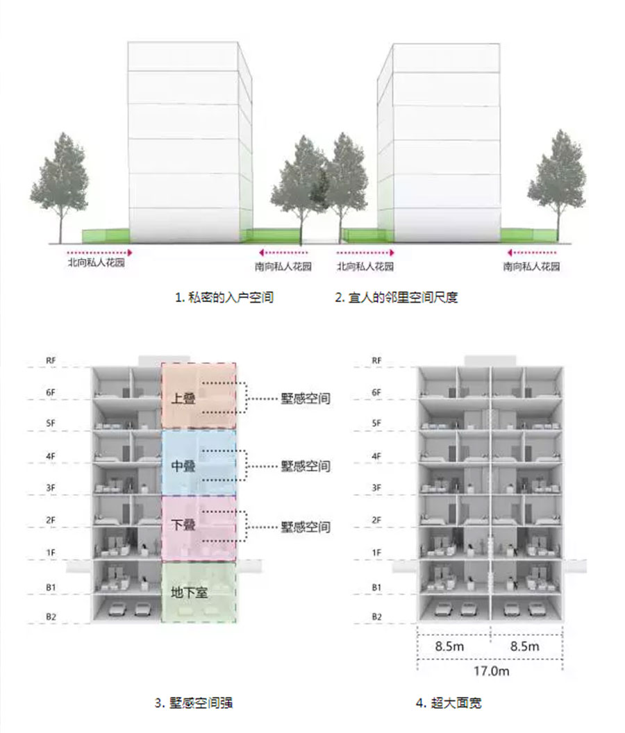 建筑由南到北均匀依次排列,围合成若干建筑组团。楼栋间距在限制条件下尽可能拉大,来达到拥有前庭后院的轻奢宅院。实现上有“天”(露台),下有“地”(院子)的理想居住场所。