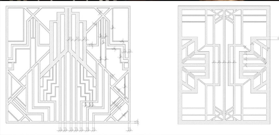 在阳台栏杆的设计上亦是独具匠心,栏杆侧装,铝板外包,控制450mm高,减少阳台挑梁的笨重感,让整个出挑的阳台多份典雅。机械感十足的花纹金属栏杆(如下图所示),从《了不起的盖茨比》的电影海报中提取简化,尽显贵族气质。