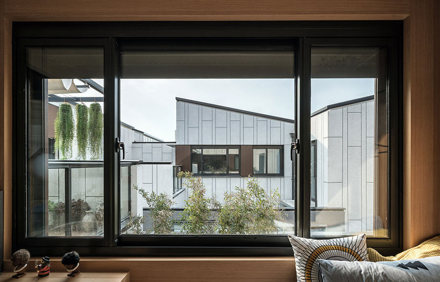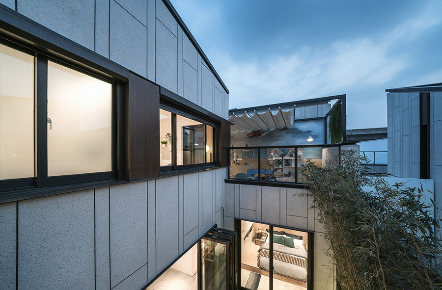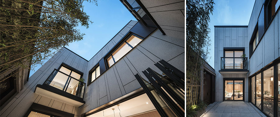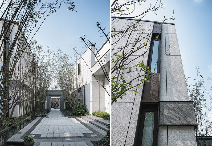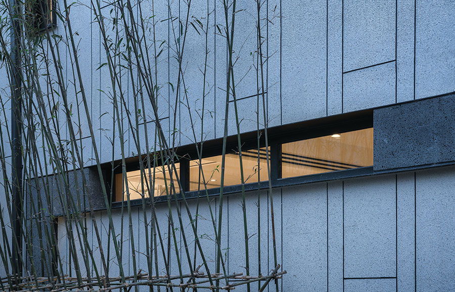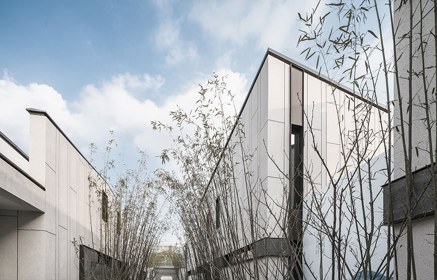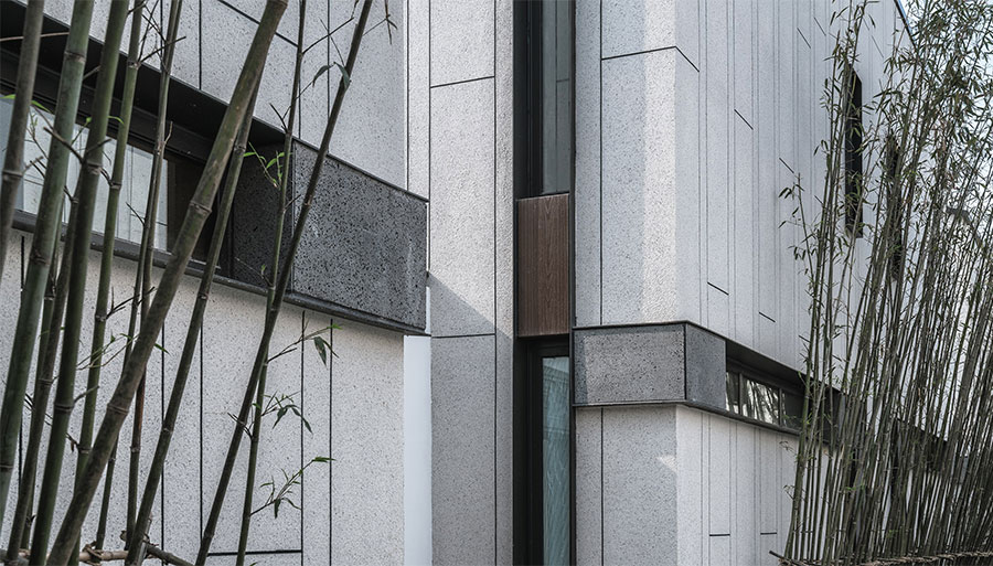 “白色生绢,亦名为素”。建筑主体采用素色仿石涂料,恬淡朴素。竖向的竹节拼缝疏密有致,让建筑多一分细致。错落起伏的屋檐是这个建筑的精神,我们用挺拔的暗灰色铝板加以提炼概括。窗间点缀木纹转印铝板,温暖的木色让建筑不至冰冷。局部采用灰色洞石,斑驳的洞石是一种颇有水墨意境的材料,以8mm钢板收边,自然的肌理与硬朗钢板相互碰撞,理性与感性相映成画。