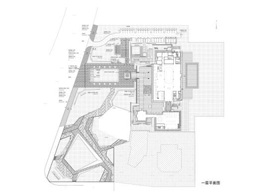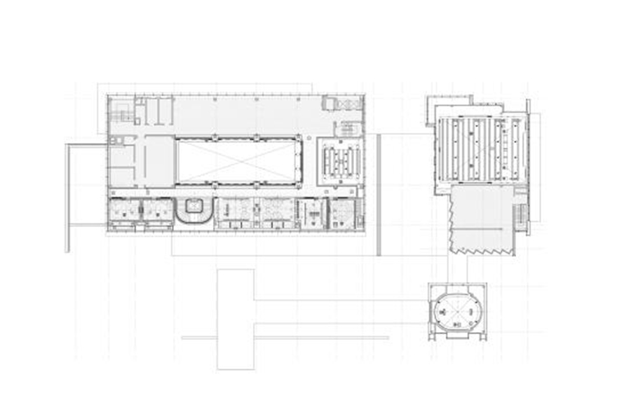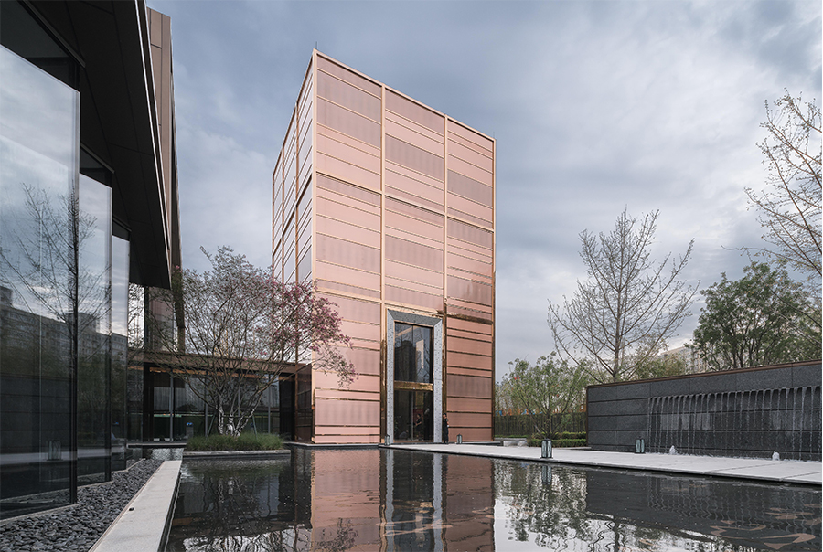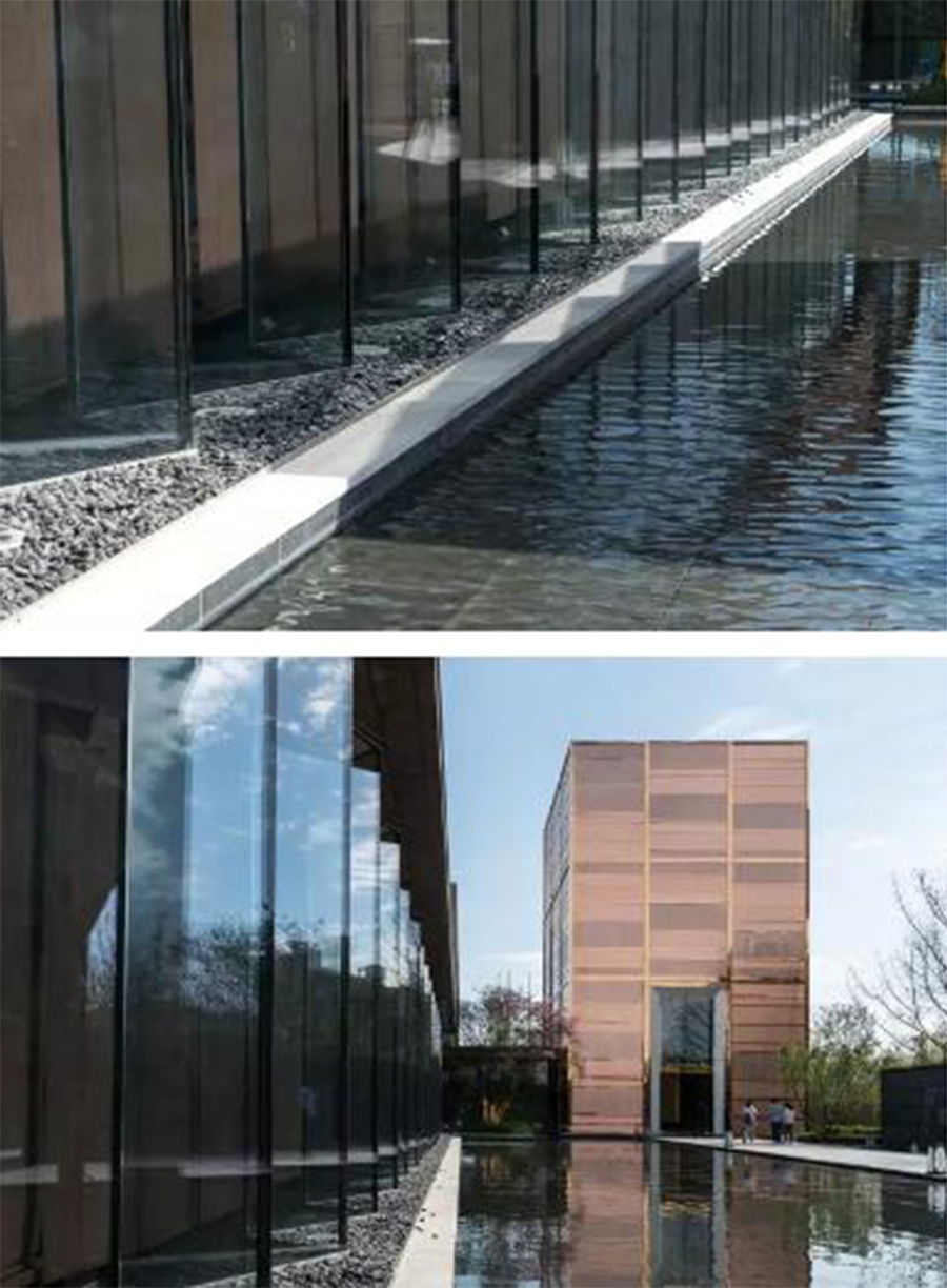 建筑主体由四栋高低错落的主楼围合而成,中央庭院以水景为主。水院以东一字排开一系列展览空间,囊括了即将销售的主力产品。整个空间布局大开大合,气脉通贯,首尾相连。