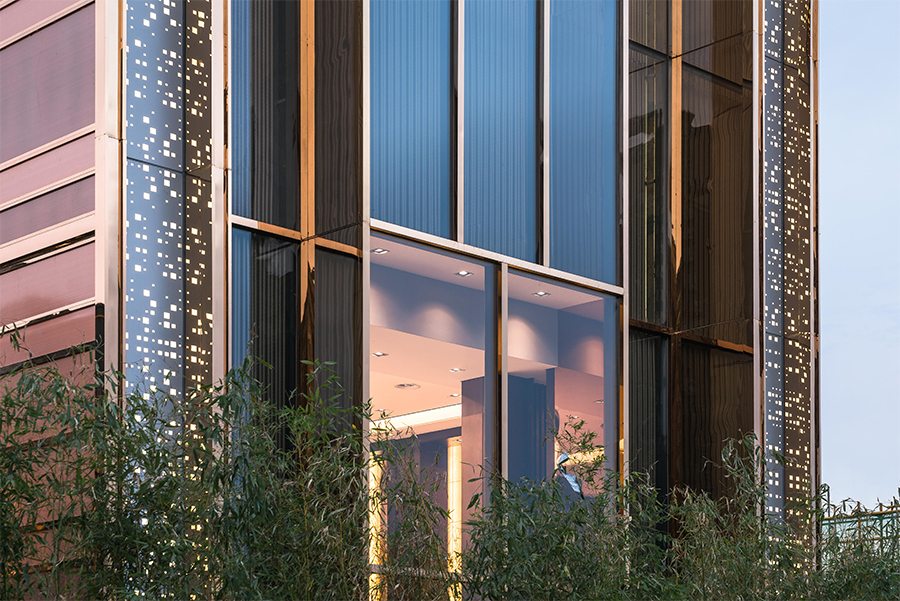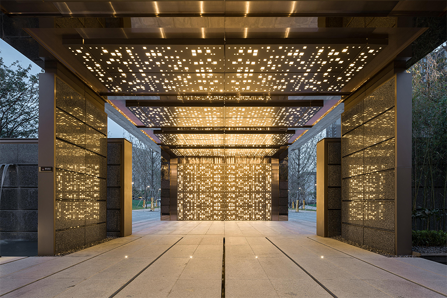门厅的精细化设计是本案的一大亮点。入口采用拉丝辅以镜面铜质面,精致大气。两侧简洁内敛的景墙暗示着进入主院之后即将展开的空间序列。墙面和吊顶的设计为穿孔铝面,辅以暖调灯光的烘托,倒影在水面上,整个空间使人仿若夜坠璀璨星河。