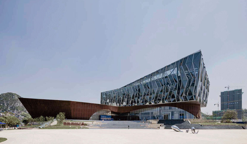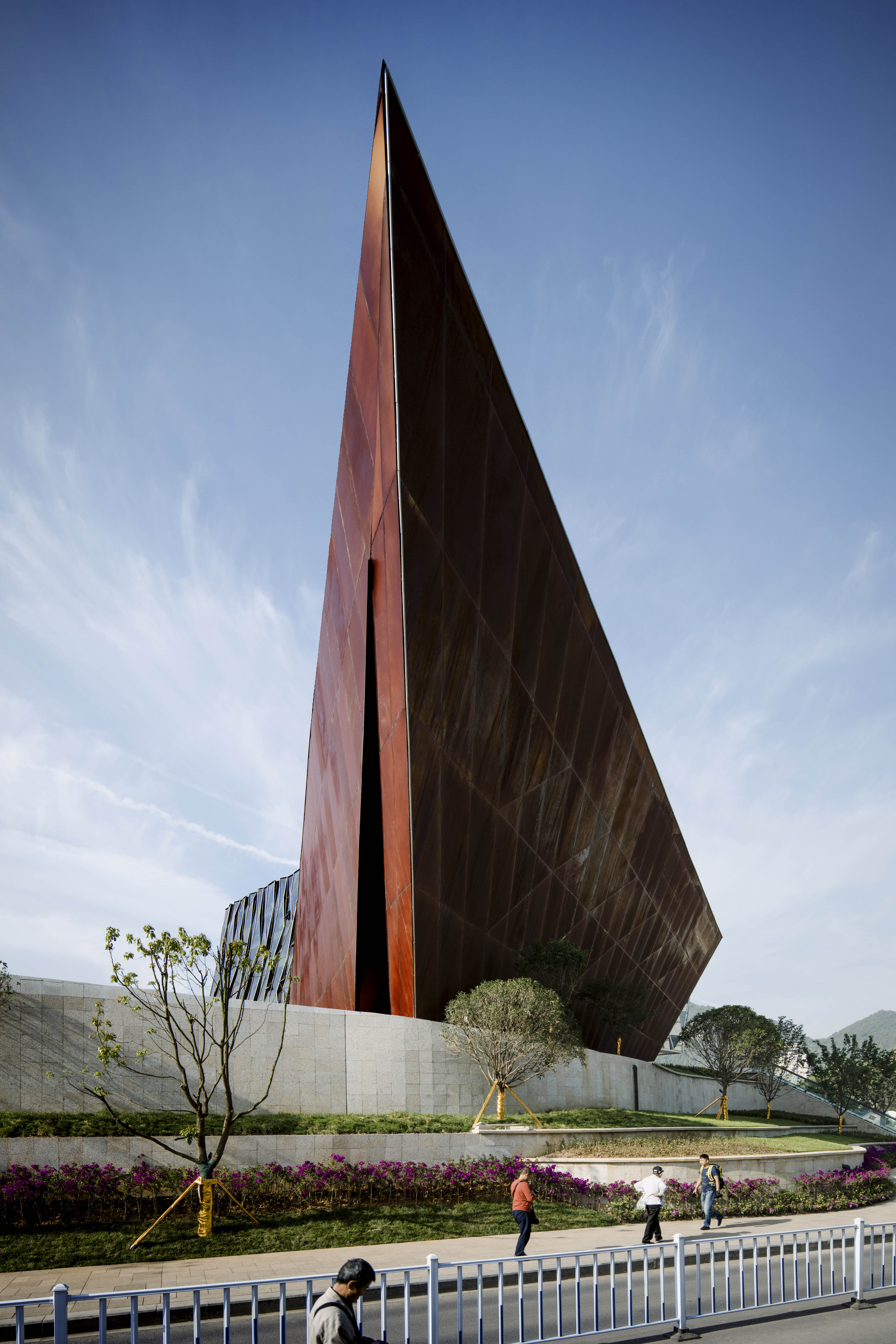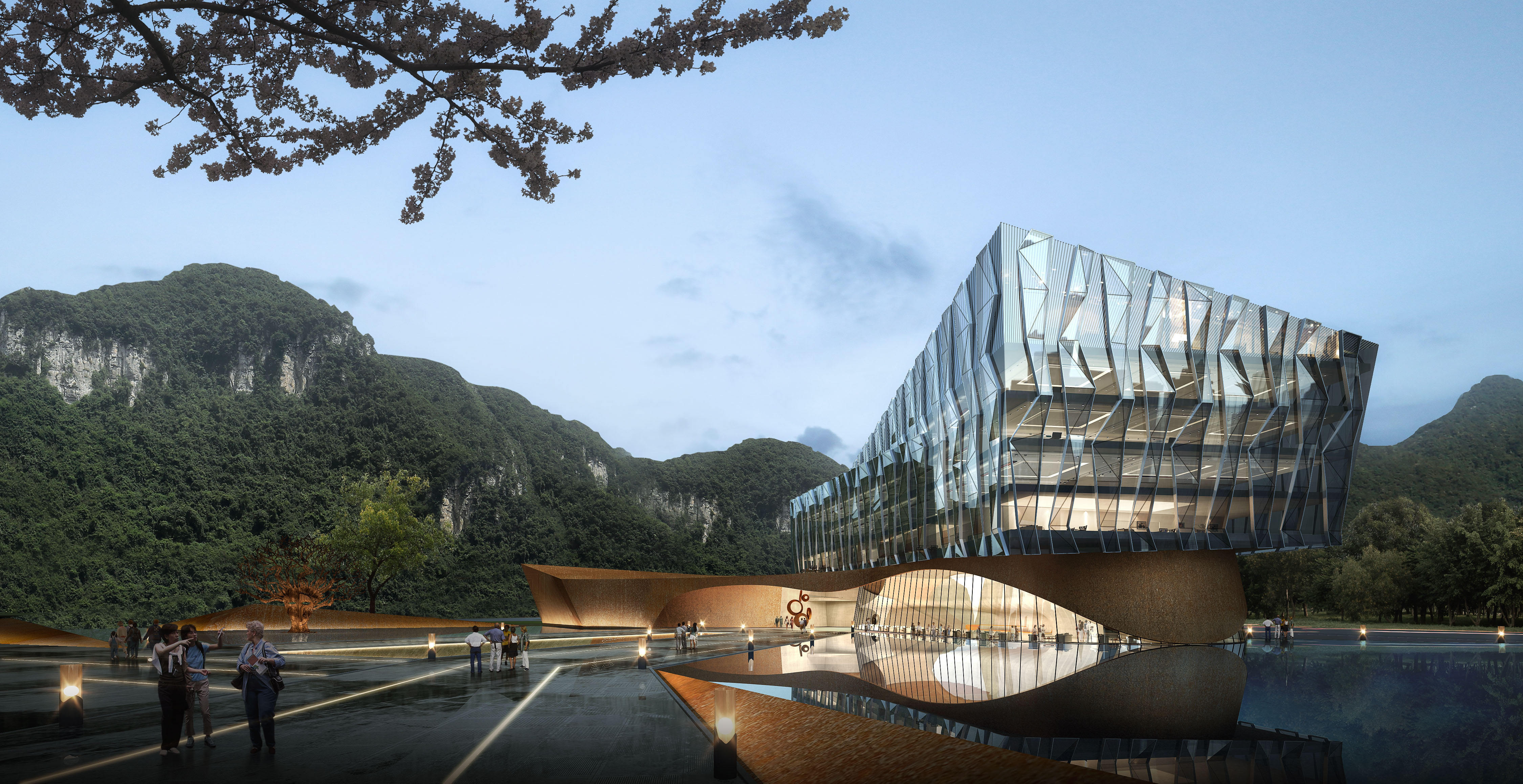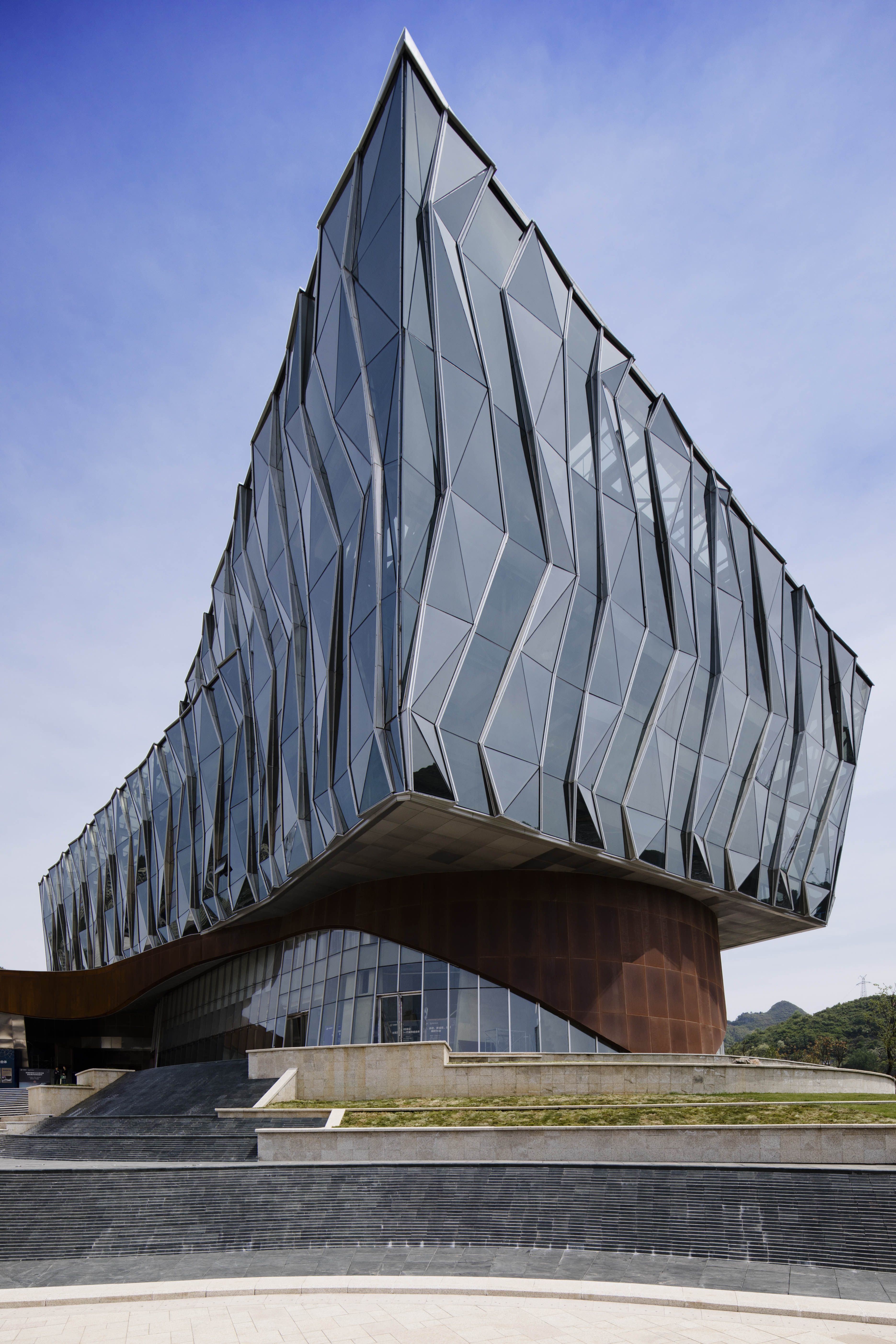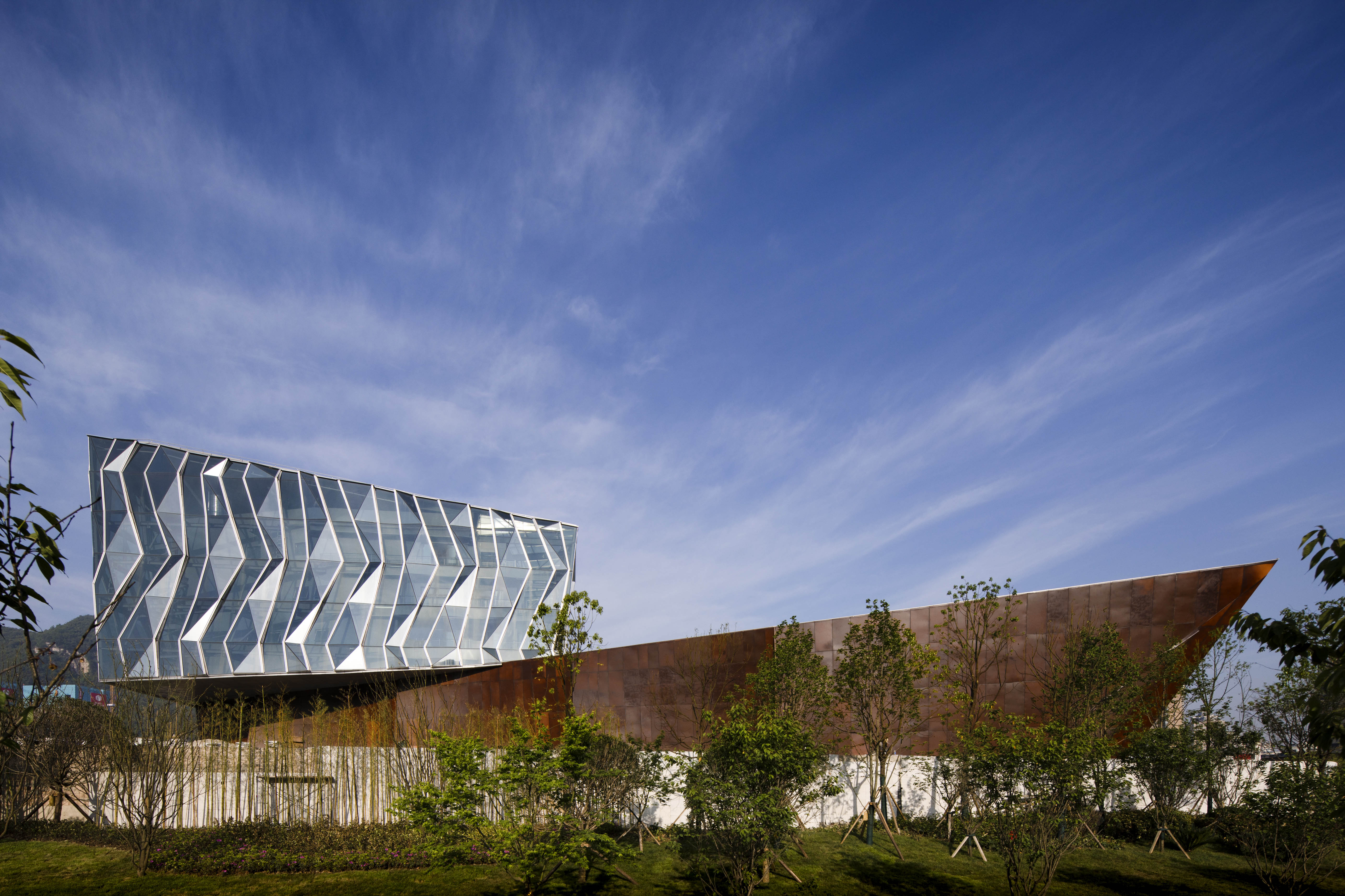 建筑主体由二层10米的锈钢板主体和四层20米的玻璃盒子交叠,接待中心背山而坐,场地中心面向人工湖水,建筑依山傍水,风景甚佳。漂浮空中的透明盒子采用不规则斜面,大尺寸玻璃面板拼接而成;将湖面的观景视野最大化。锈钢板主体表皮映衬着远处山脉的轮廓,使人“不出城郭而获山水之怡,身居闹市而得林泉知趣”;整个空间布局开阖有致,建筑与水景互为阴阳,藏风聚气暗含风水,释放了场地环境的最大优势。