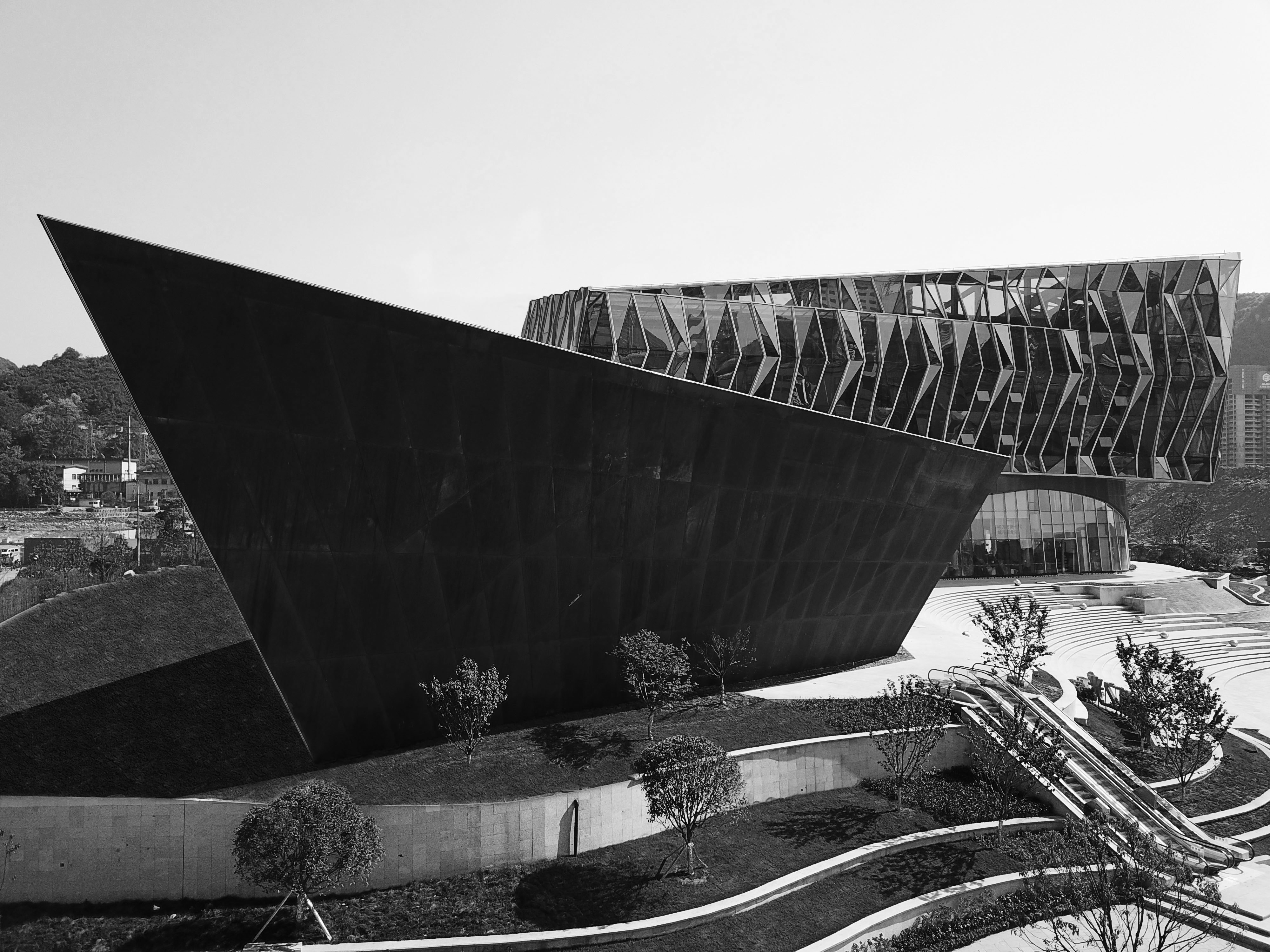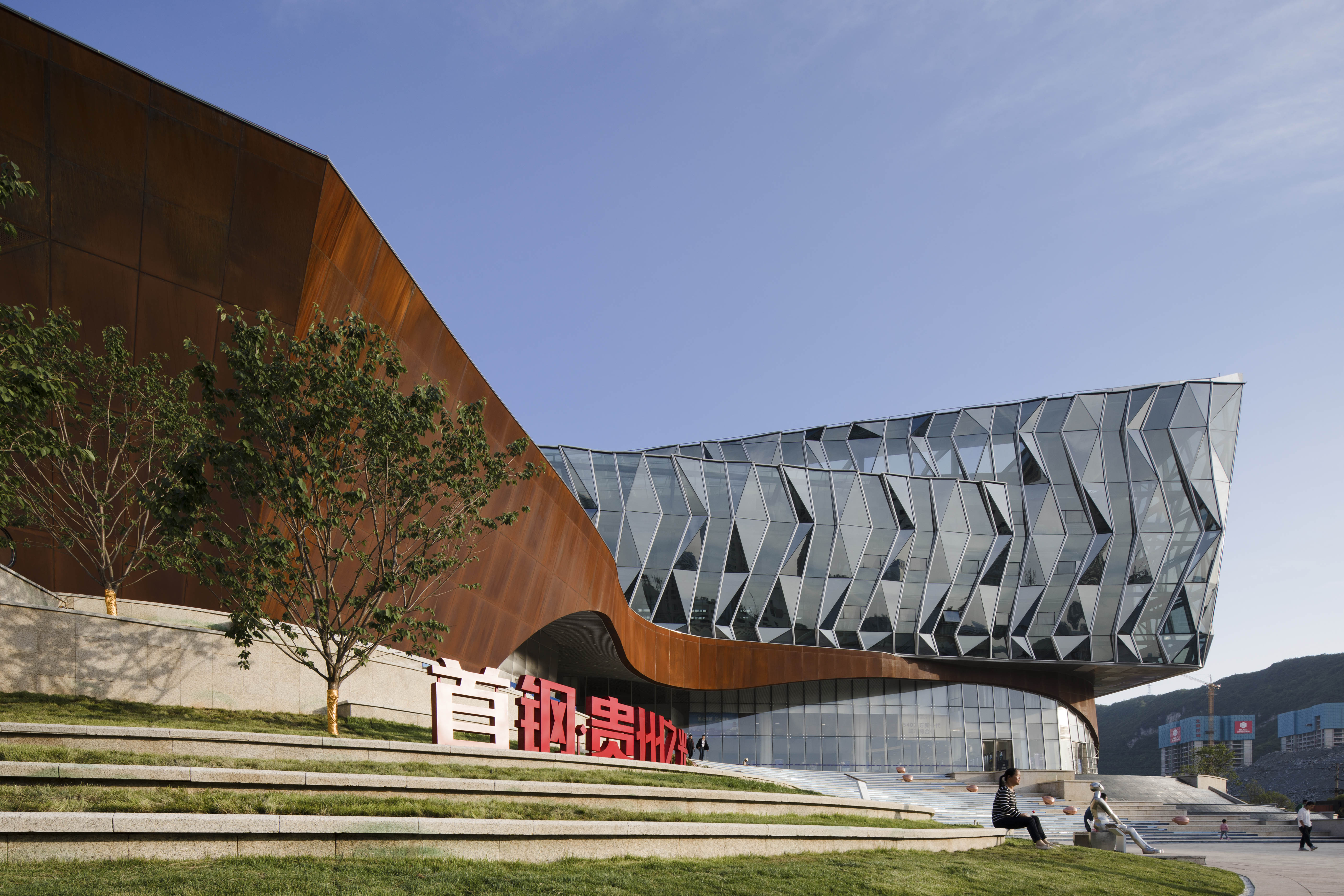 设计师刻意采用了提取钢厂文化元素作为建筑底部主体色彩,耐候钢板+局部穿孔的研究使建筑更具艺术气息;与山形投影的玻璃幕墙结合的感觉让建筑整体气质更加融合当地氛围,营造一种原生态的感觉。上半部建筑采用大面积玻璃幕墙展开,映透出黄金比例切割的玻璃表皮机理;凹凸的材料质感更是加强了建筑表面的光影关系,使立面更加丰富生动。现代元素与钢厂文化的碰撞,强调锈蚀钢粗野的原生态设计感,更有老钢厂历史的穿越感;玻璃部分强调精细化的设计,表现精致现代生活的时代感,使整体设计更具有意境,更具有想象。