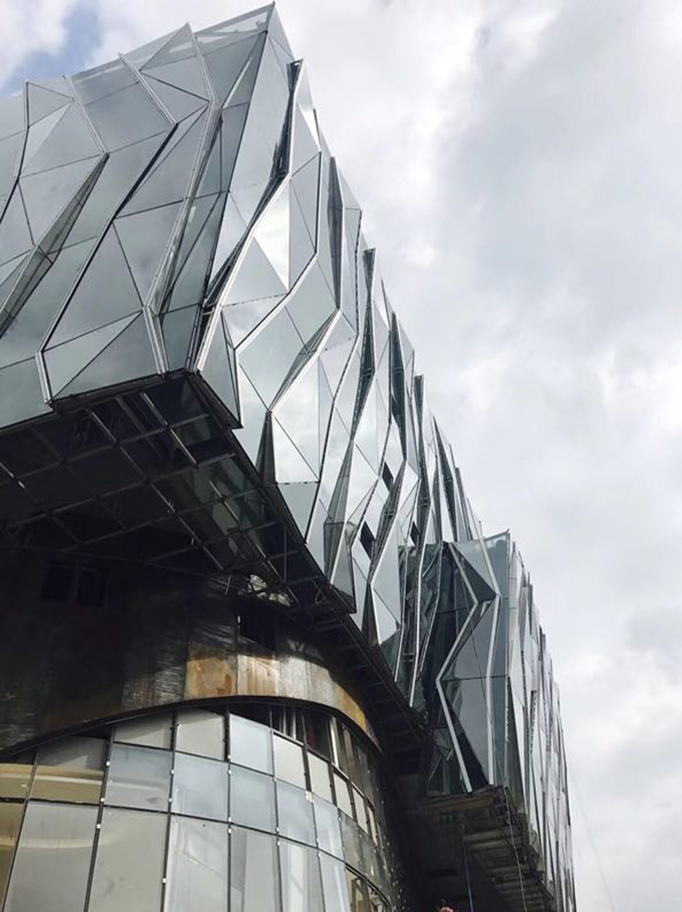 针对传统施工单位对于项目的二维图纸的思考方式,为了保证项目整体造型的完整性,引入BIM的团队帮助;bim技术完成尺寸达到 3mX4.5m的单面玻璃进行表皮设计;不规则的斜面,且无相同的尺寸玻璃对施工安装提高了难度。单体体量之大可见一斑。在三维模型上实现结构施工的合理化,修正土建误差,并同幕墙方案进行碰撞检测试验,在施工之前做到提前发现问题,合理优化方案。同时在幕墙方案中,通过参数化表皮计算,模块化整体立面造型,输出精确节点坐标与尺寸。从而使得整个方案可以在施工阶段形成模块化数据化从而方便施工单位对于样料的整体采集。