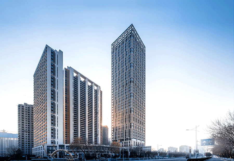 山东日照华润置地广场位于山东省日照市东海之滨。由一栋170m超高层写字楼,一栋120m米和一栋100m高的观海公寓以及三层沿街底商构成。建筑构图为简化现代三段式。类竹节的图形抽象象征勃勃生长之态。