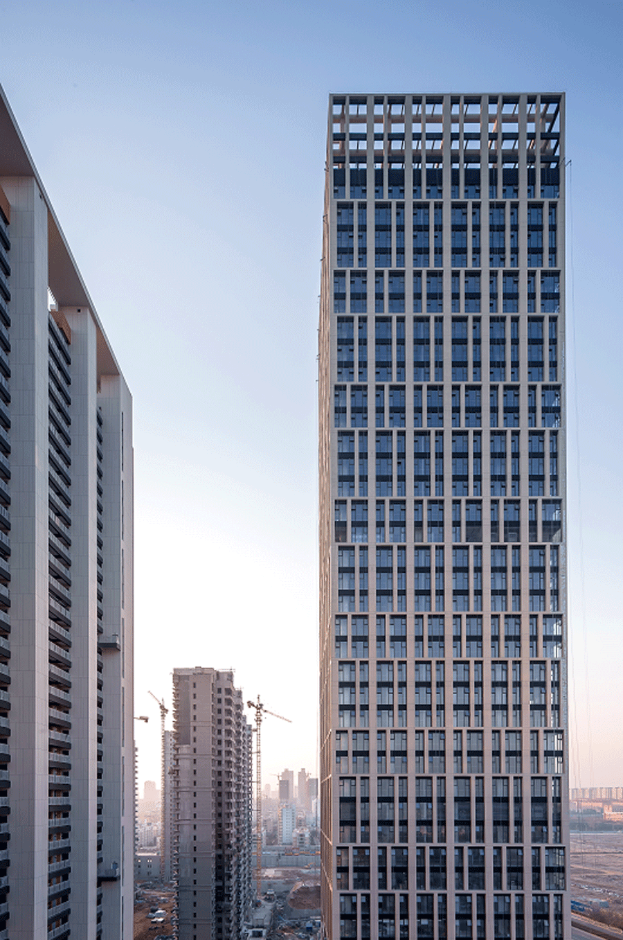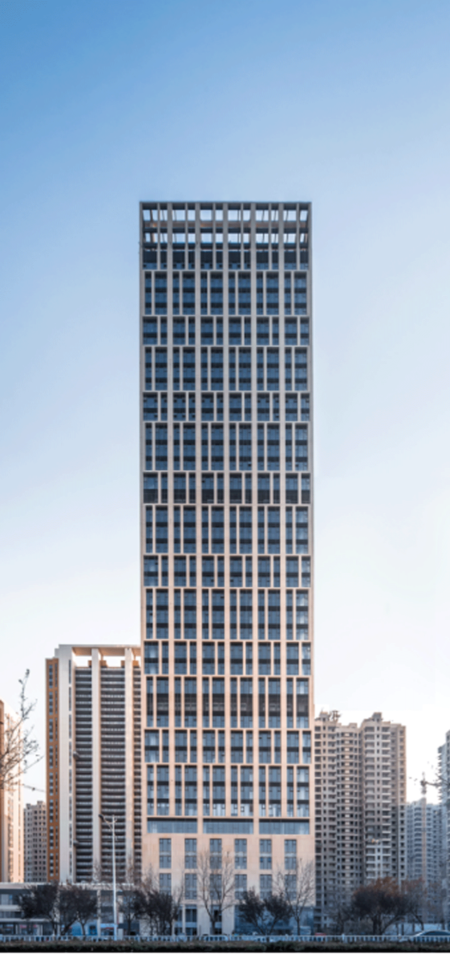 底部6层作为基座,以实墙面为主,除竖向大窗与跨层的窗间墙外全部以陶板干挂作为外墙材料。7层为横向连续横窗,作为腰线。8-41层间隔两层和三层利用造型柱进行模数化排列,再将每两层和三层作为横向单元进行反复叠加,错位对位,直到塔冠以四层模数单元收头。