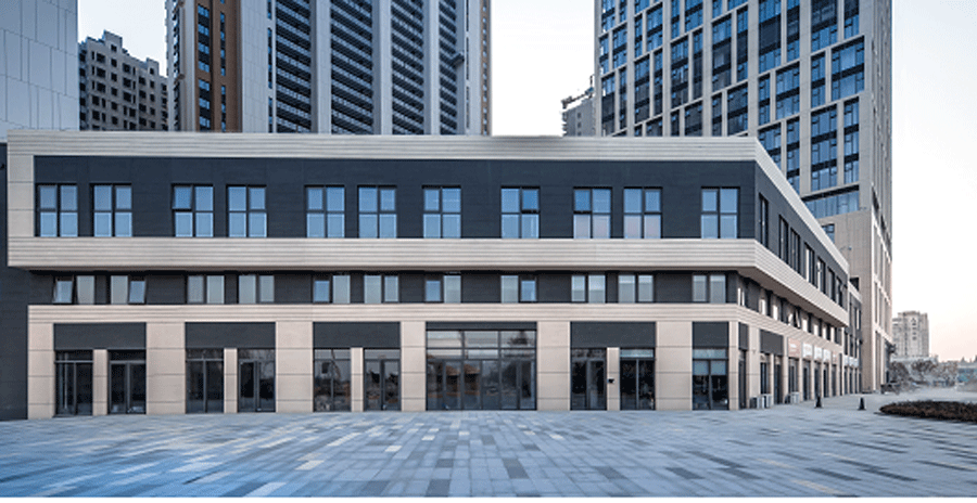 因为三线城市的市场因素,严控立面成本确实成为了实现效果的最大制约和挑战。170米写字楼、三层商业裙楼全部为窗系统。材料方面上除了写字楼底座运用了一部分陶板外挂,其余立面包括公寓及沿街商业,均为造价极为低廉的一体板工艺(保温板+弹性涂料)来实现外墙效果。