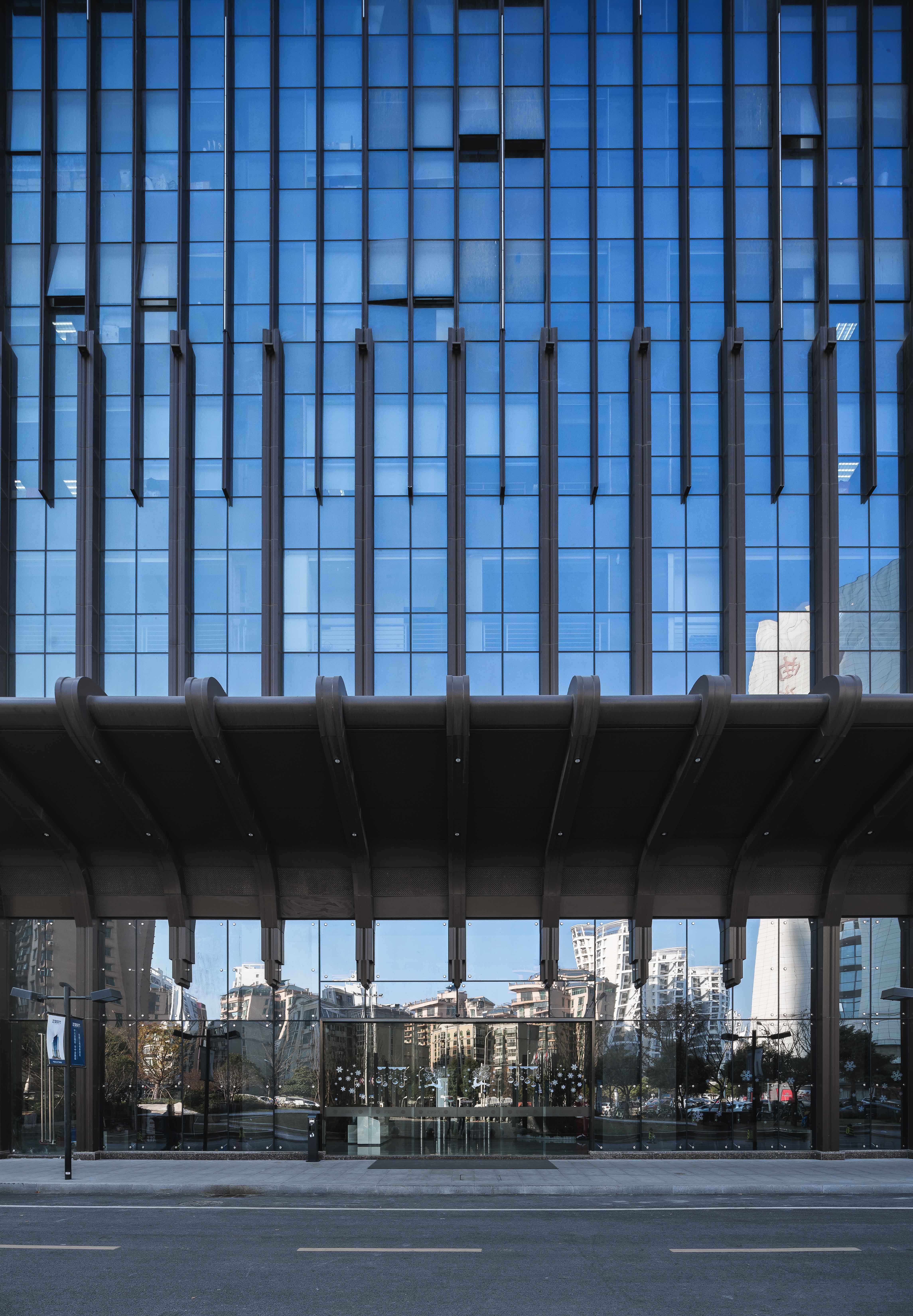 办公楼入口处的雨棚,正面采用的是钢结构龙骨外包铝合金扣板的做法,侧面为穿孔铝板,形体上采用流线型,使整体竖向线条的构成显得更加连贯,收分更自然。