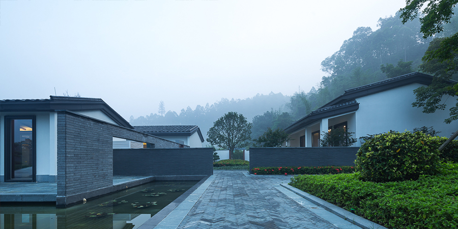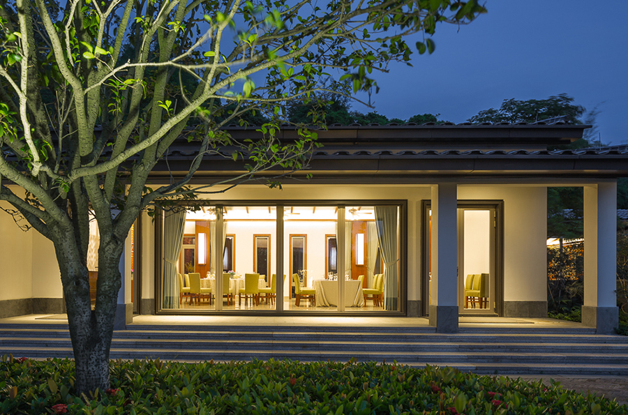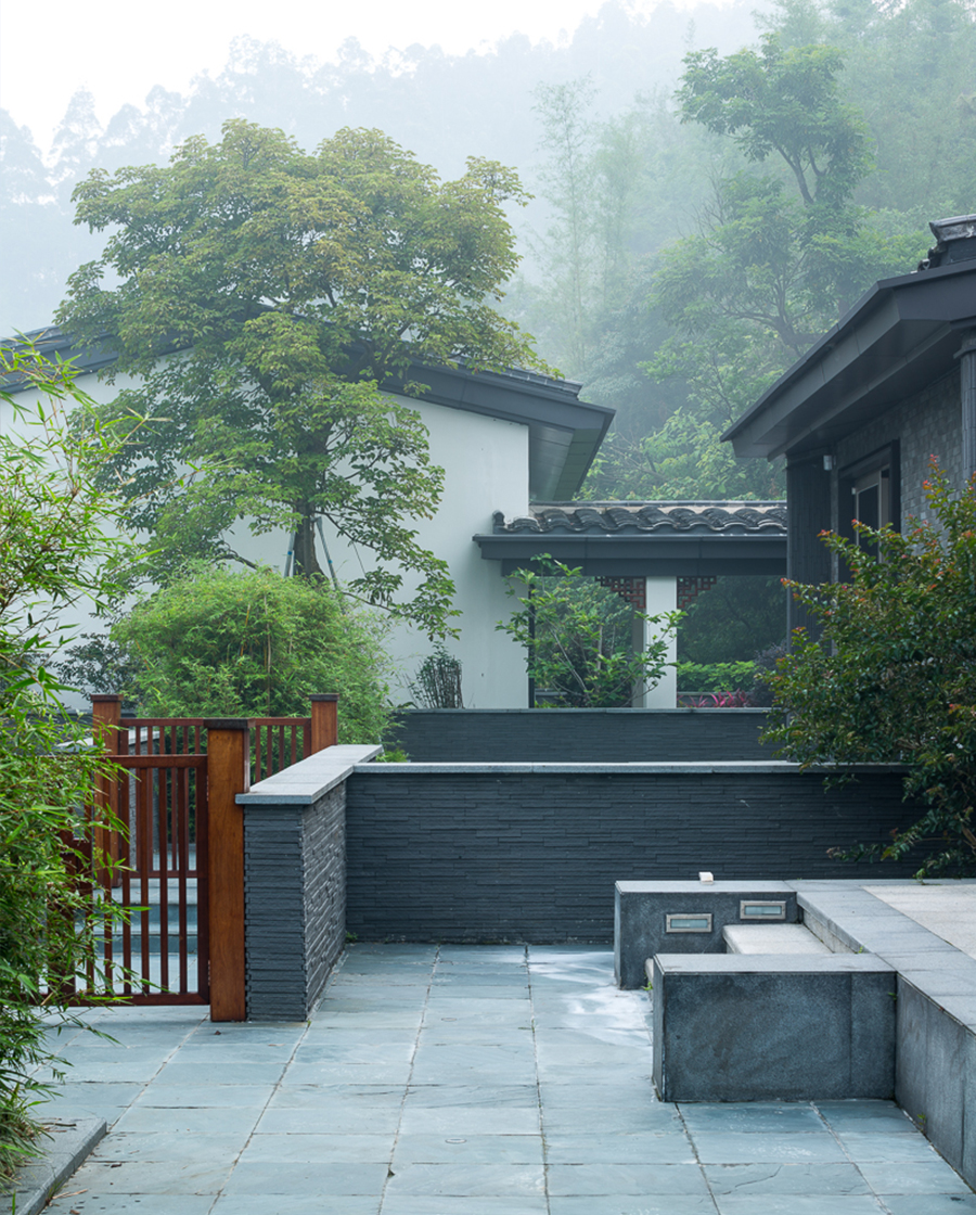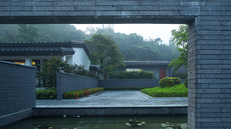 不同于传统的酒店,本案在整体格局上以中式院落为主体设计风格,在娟丽灵秀的大泗山山脚下,院落内石桥流水,竹林飒然,韵致的江南古典建筑与时尚的新中式风格在这里融汇交集。