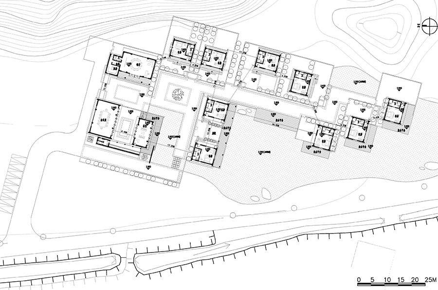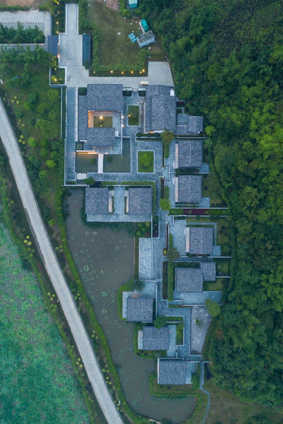 院落由十二个建筑单体组成大大小小不同的院落空间,庭院内共设客房9间,全部以开阔通透的单层套房构置,并配备多功能会议厅。不同院落间穿插着荷塘、绿地等景观。院落间风荷树荫蔽日,青苔茵茵,路径曲折,真是一步一景,步步留恋。院落中的建筑,宽大的落地窗,朝山、面水、向庭院,跨出一步就能融进景中。