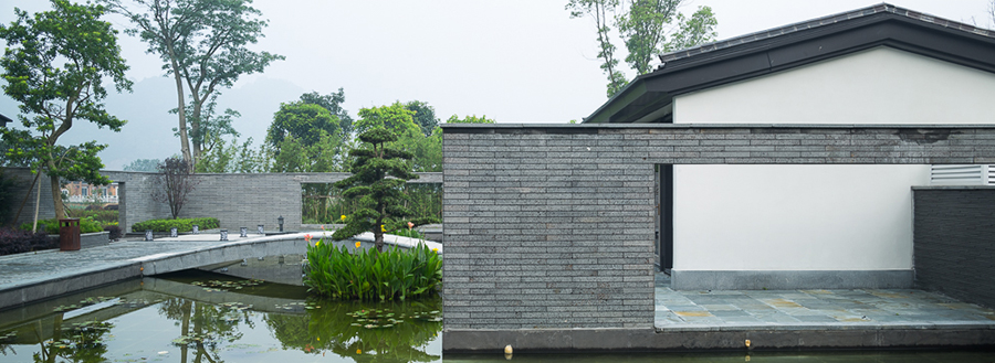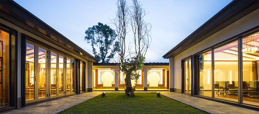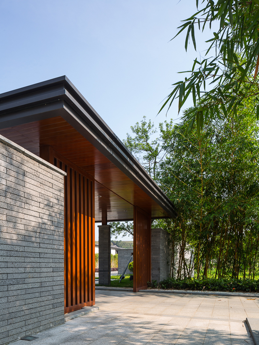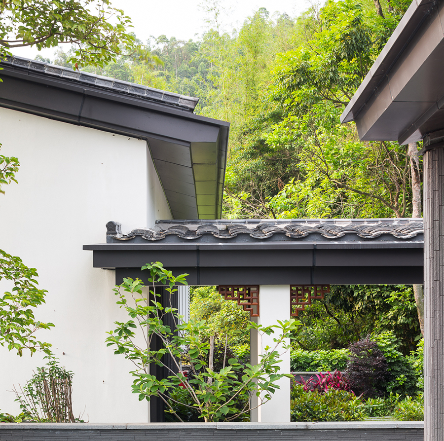 建筑的布局以传统院落为雏形,延续传统建筑一贯采用的覆瓦坡屋顶,根据地域特色吸收了当地的建筑形式及色彩,自成特色,体现了新中式风格的风貌,突显中国文化的韵味。通过现代建筑材料和设计手法修正传统建筑中的各个元素,并在此基础上进行必要的演化和抽象。