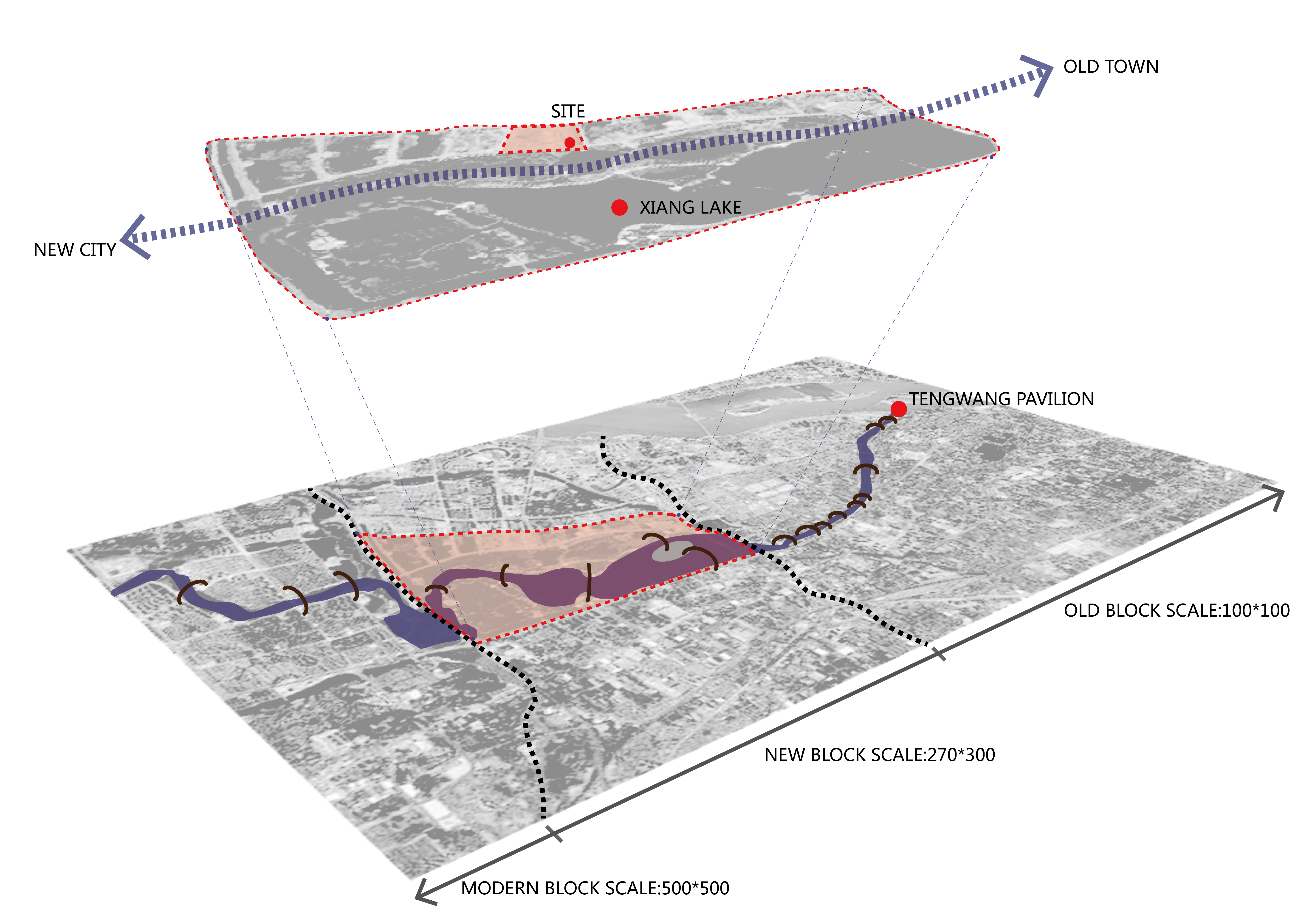 项目位于南昌市象湖西岸,真君路与云锦路交汇处,属于西湖区朝阳新城规划板块内。探查西湖区的城市形态会发现,新的城市架构显著区别于老城的延伸结构,这个格局随后逐渐延伸到象湖南岸,彻底并轨进大尺度的现代街区。“滕王阁三角洲”南流的抚河试图保留这个城市的山水特征,并将桥梁转变为城市设计的主要元素。和其他20世纪前作为延伸结构的街区一样,项目所在街区体现了现代性所引发的规律性渴求,以及同等性和同质性的指导原理。因此,这些街区允许将谨慎和端庄等典型的资产阶级品质体现在其建筑外表中,而这种设计的自由则受到了标准规范的限制。而本案则欲意取证这座当代城市的形态记忆,着力避免空降的形式呓语,留守文脉边陲。